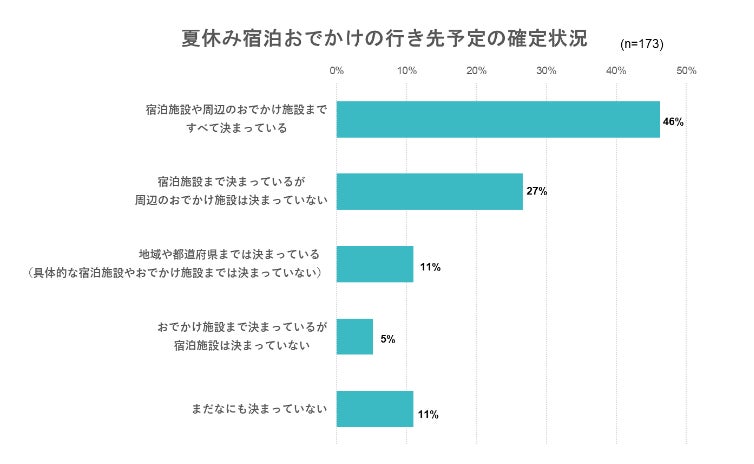 「宿泊施設や周辺のおでかけ施設まですべて決まっている」という人が48%、「宿泊施設まで決まっているが周辺のおでかけ施設は決まっていない」という人が26%と、7割以上の人が既に宿泊施設まで確定していました。