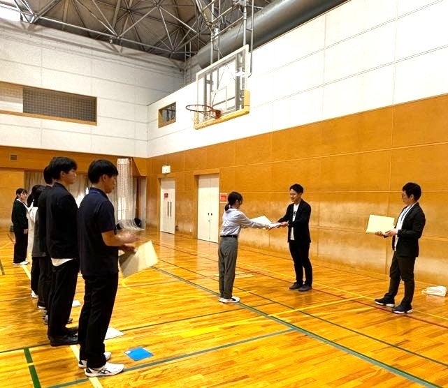 内定式は、広々とした体育館で実施されました。2025年新卒内定者9名の内定証書の授与と自己紹介が行われ、内定者研修で学んだ自己紹介のポイントをさっそく活かすことが出来る機会となりました。