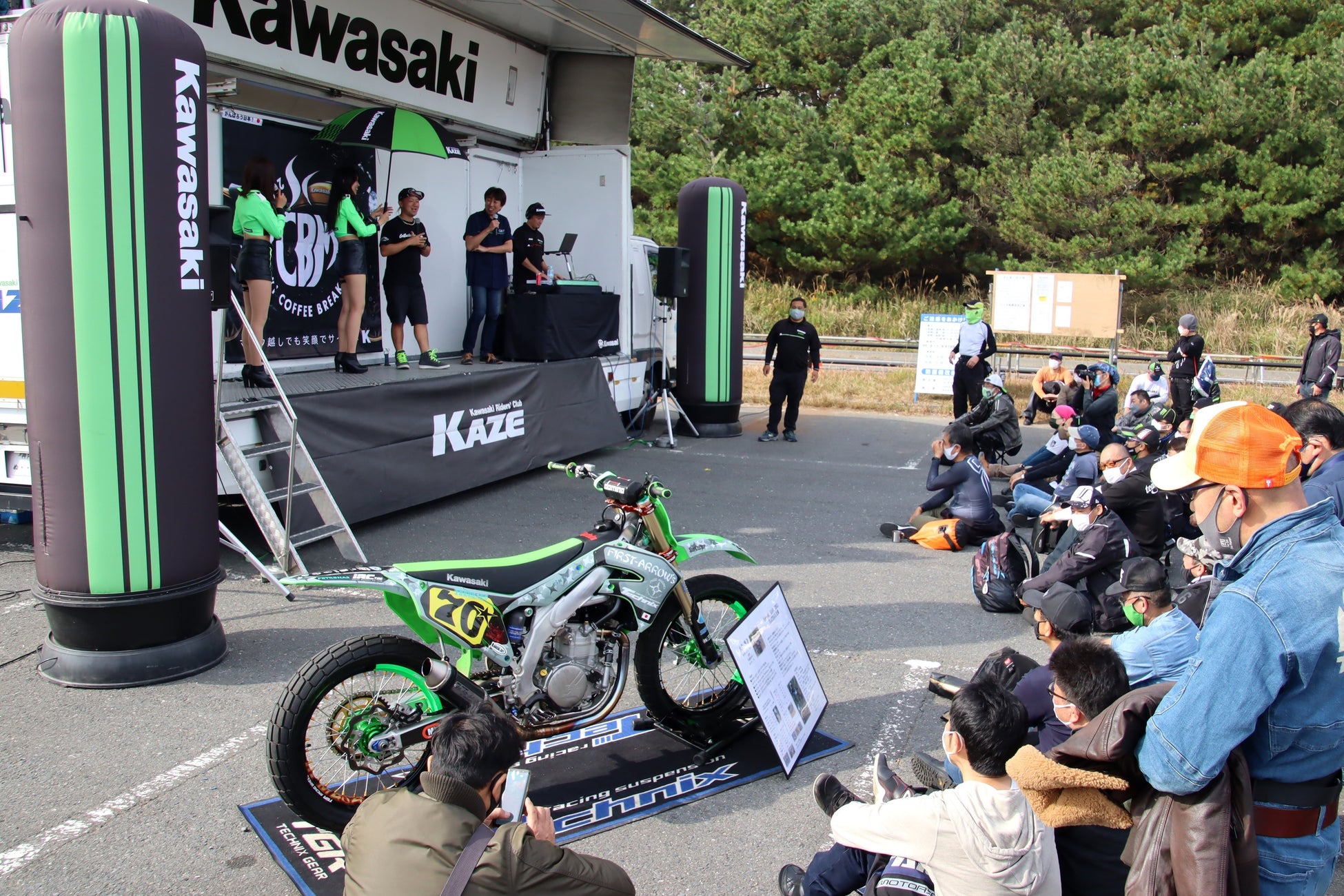 最新のモデルから往年の名車まで3,500台以上の様々なカワサキモーターサイクルが整列した会場内では、見て回るだけでも楽しく、また、イベントステージでは、KAZEギャルや特別ゲストのフラットトラック世界選手権日本代表大森雅俊選手(KAWASAKI Catala Racing Team 、使用車両:KX450)のトークショーやじゃんけん大会を実施。来場された方は競技を初めて知る方も多く大森選手の話を食い入る様に聞かれていました。