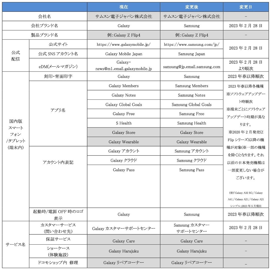 ※グレー部分記載の会社名ならびに、製品名「Galaxyシリーズ」「Galaxy Store」「Galaxy Wearable」、保証サービス「Galaxy Care」、ショーケース「Galaxy Harajuku」、ドコモショップ内修理「Galaxyリペアコーナー」の名称は、社名・プロダクト名およびスマートフォンサービスとして運営しているサービスのため、「Samsung」名称への変更はございません。