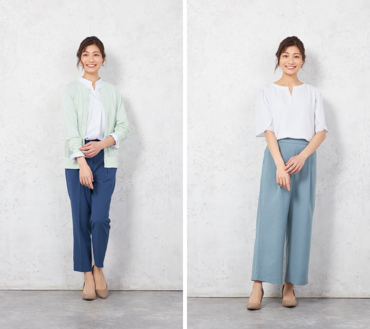 あたたかくなる季節のオフィススタイルにマッチする涼しげカラーとさらっとした麻調の軽い着心地のパンツが新登場。選べるワイドとテーパードのシルエットで好みに合わせたスタイリングをお楽しみいただけます。ベーシックなブラック・ネービーに加え、鮮やかなカラーが目を引く夏スタイルの定番パンツとしてワードローブに取り入れていただける一着です。ジャケットオンでオフィスカジュアルスタイルからTシャツやブラウスと合わせたきれいめカジュアルスタイルまで幅広いコーディネートに対応可能なアイテムです。