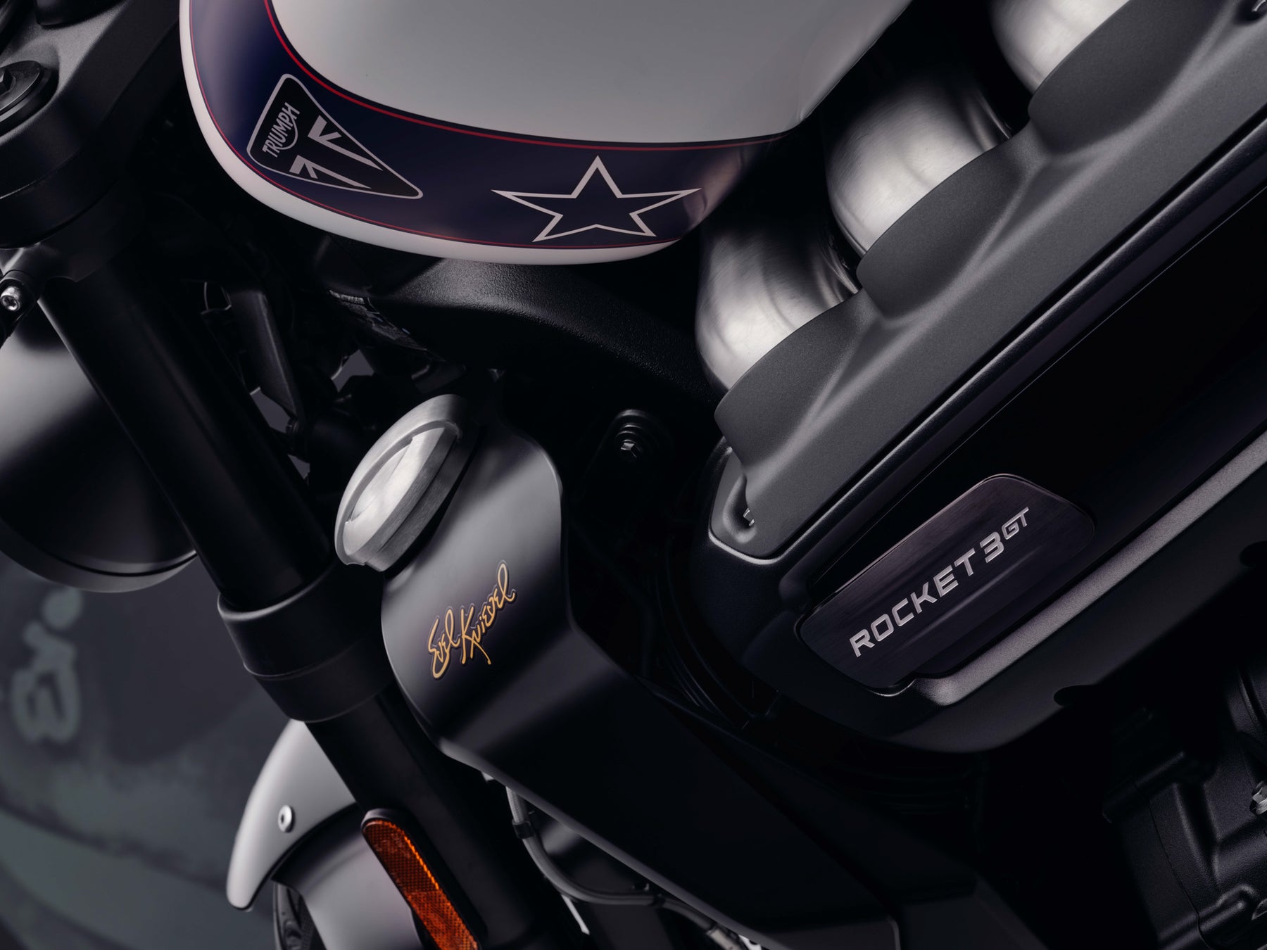 新型Rocket 3 R & GT Evel Knievel Limited Editionsは、彼が初めてBonneville T120に乗ってテレビ放映されたパフォーマンスから、シーザーズパレスの噴水を飛び越える画期的なパフォーマンスまで、トライアンフとイーベルの永続的な関係に敬意を表しています。