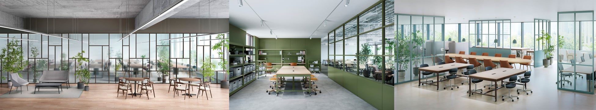 30種以上のフレームスタイルと23種のCMF(Color,Material,Finish)による600通り以上の組み合わせで、オフィスパーティションのシステム性はそのままに、飾らず、気取らず、丁度よい、オフィスワーカーの創造性を刺激する自分たちらしい空間を構築します。