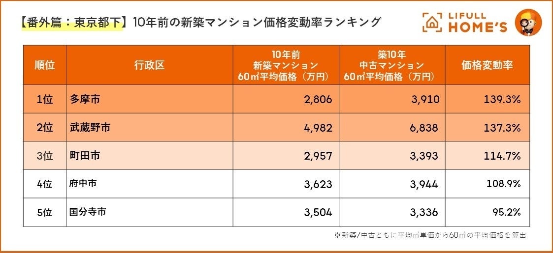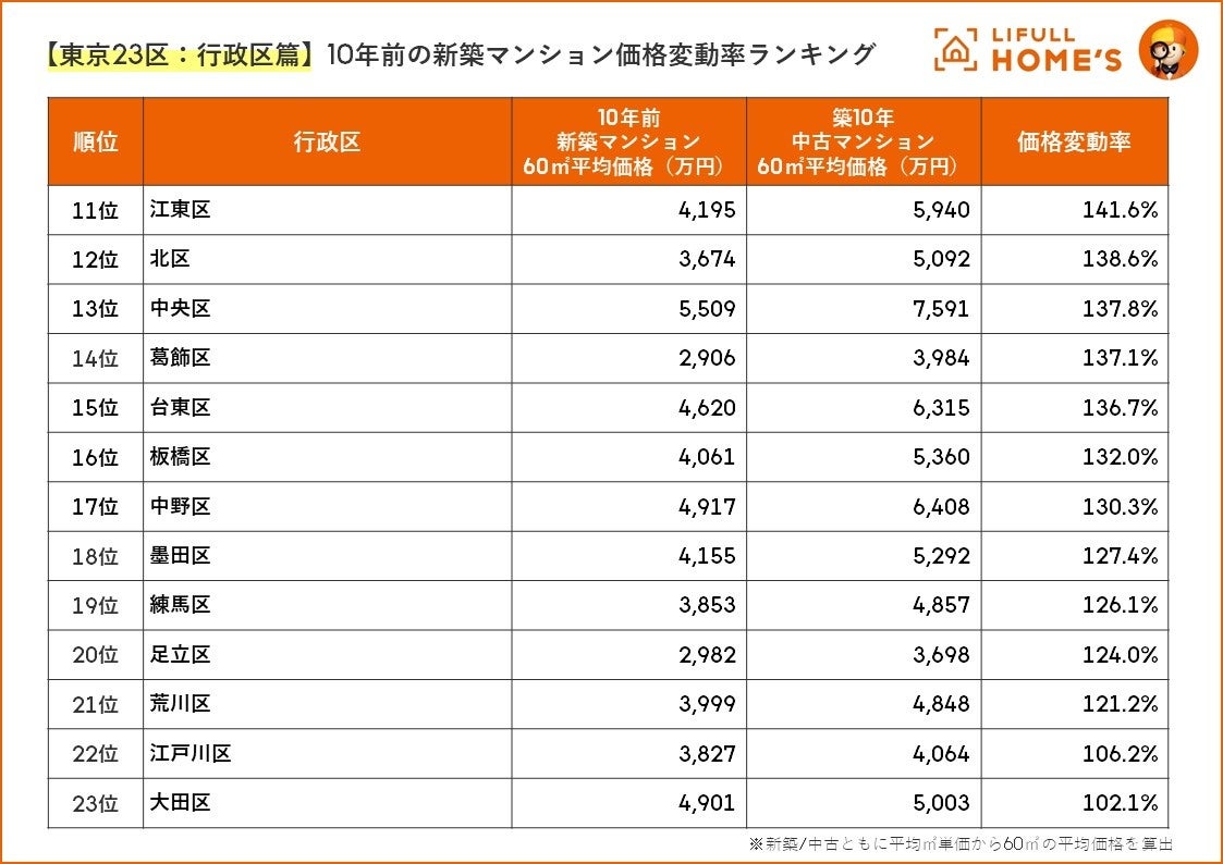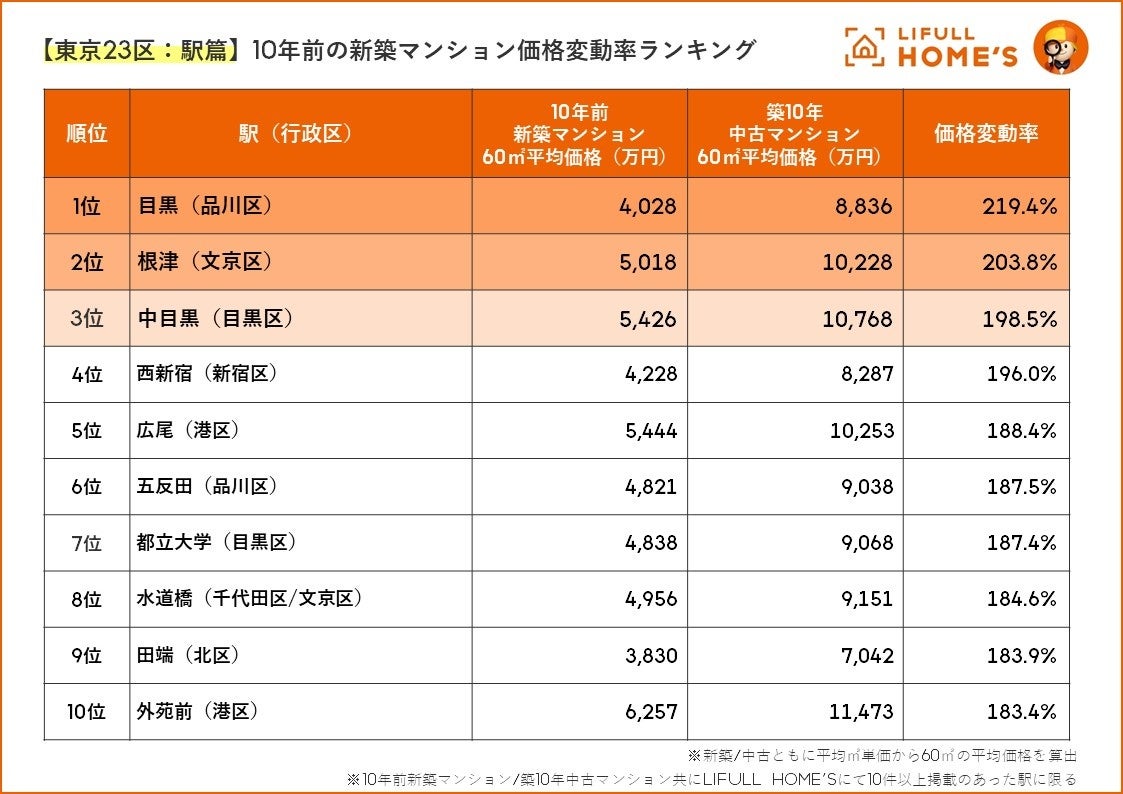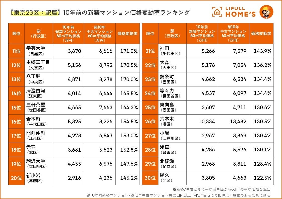 家を買うなら、資産形成も視野に街を選びたい『10年前の新築マンション価格変動率ランキング(東京23区:行政区/駅篇)』をLIFULL HOME'Sが発表