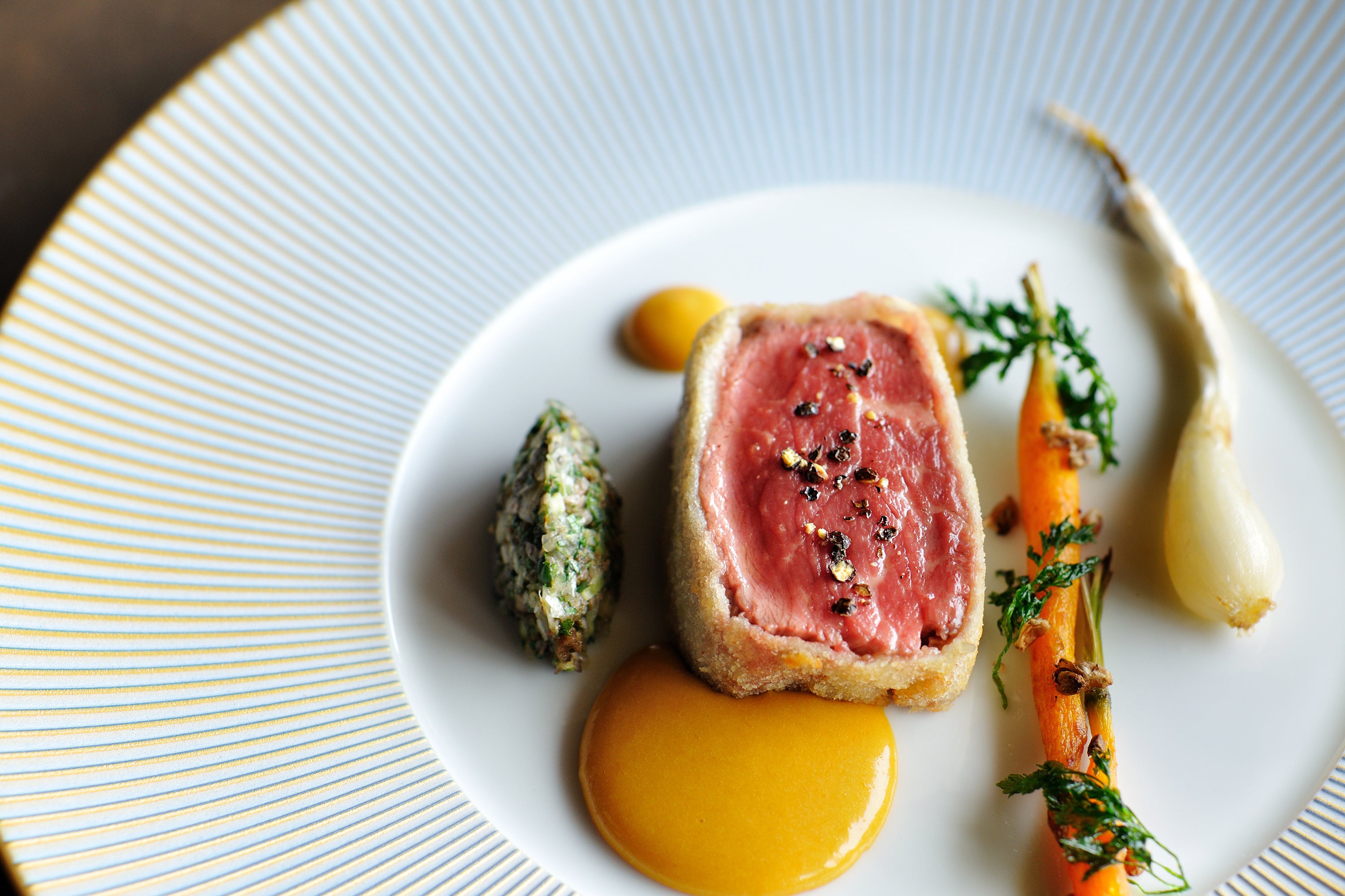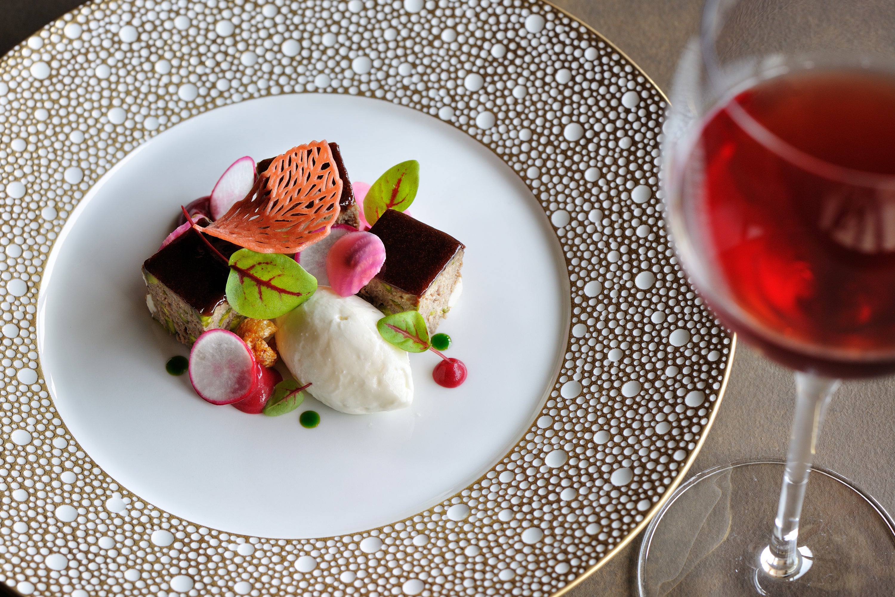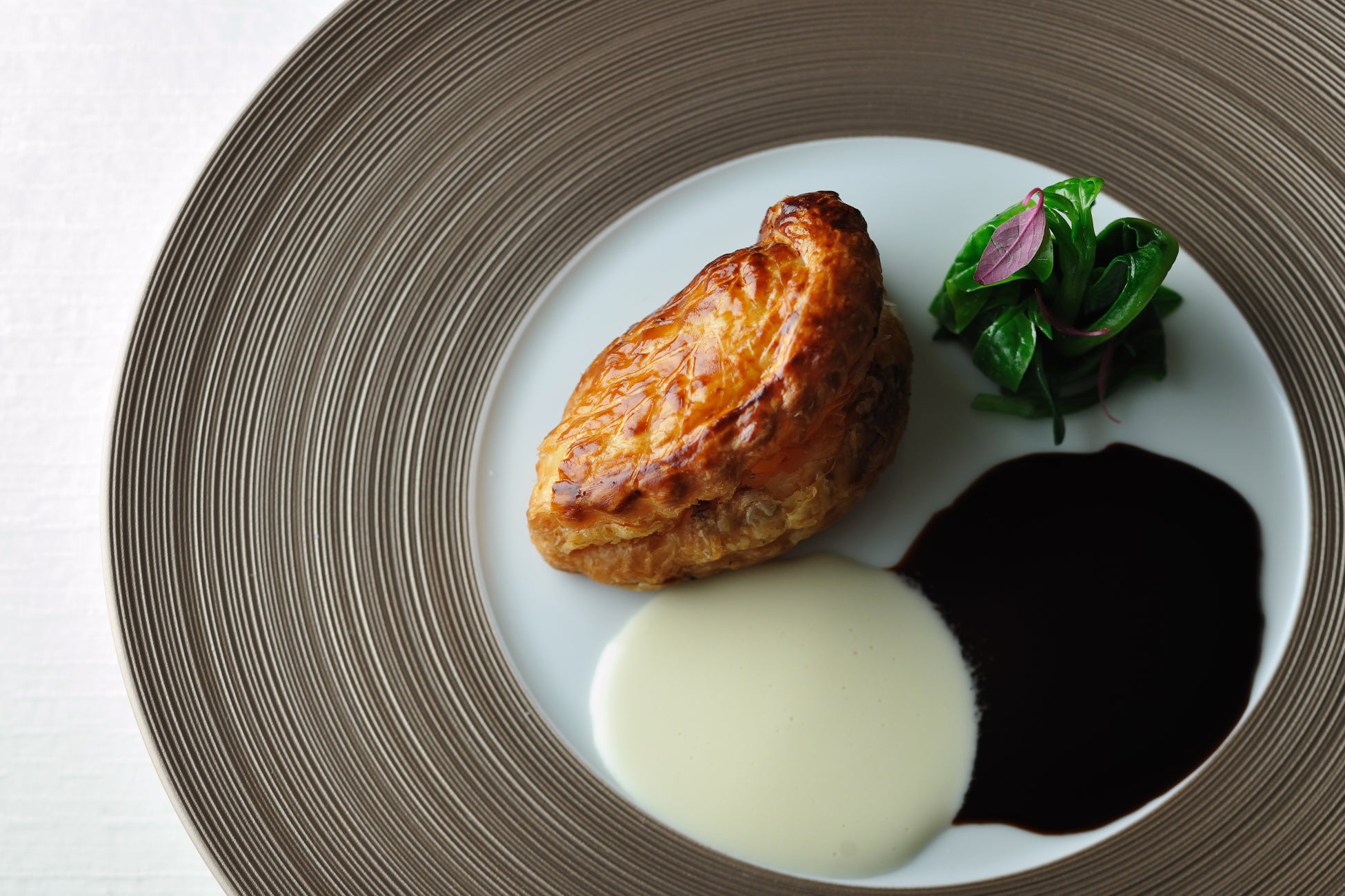 豚のミンチに車エビを合わせてパイ包みにしたクラシックなフランス料理です。肉と魚介が合わさることで深みを増した旨味がパイに沁み込んでいます。ソースは、酸味のきいた白ワインソースと、豚とエビの出汁をきかせた濃厚な赤ワインソースの2種類があり、味わいの変化も楽しめます。