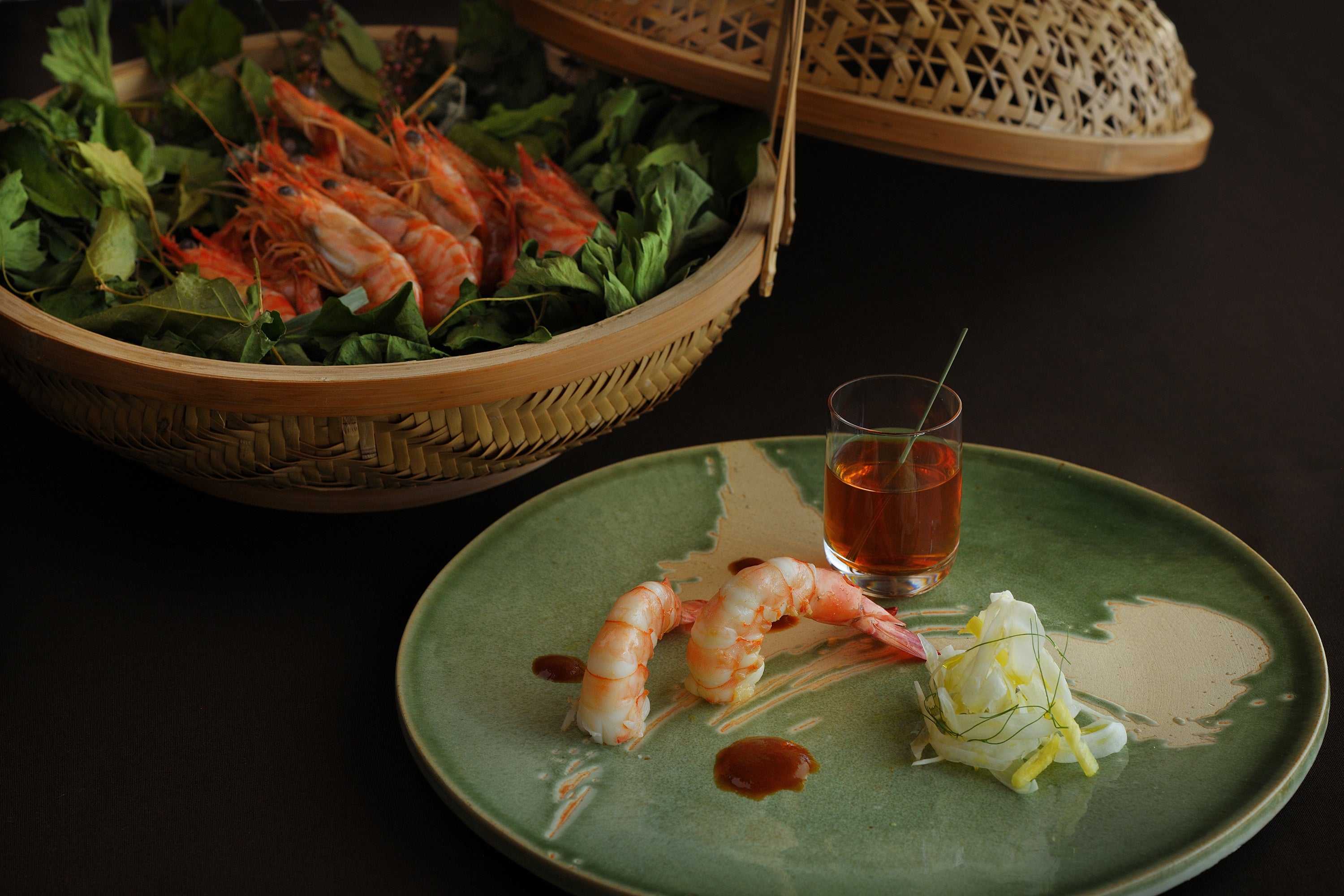 旨味が強い車エビを、グァバや月桃、ジャスミン、長命草(ちょうめいそう)といった命草(ぬちぐさ)(*5)と一緒に蒸しあげました。素材の旨味と甘みをダイレクトに感じられるよう、シンプルな味付けにしています。その代わりに複数の命草と蒸すことで、香り高いハーブ香を纏った車エビを楽しめます。車エビの殻や身からとった出汁のソースとコンソメもあり、心ゆくまで車エビの旨味を堪能できる一品です。