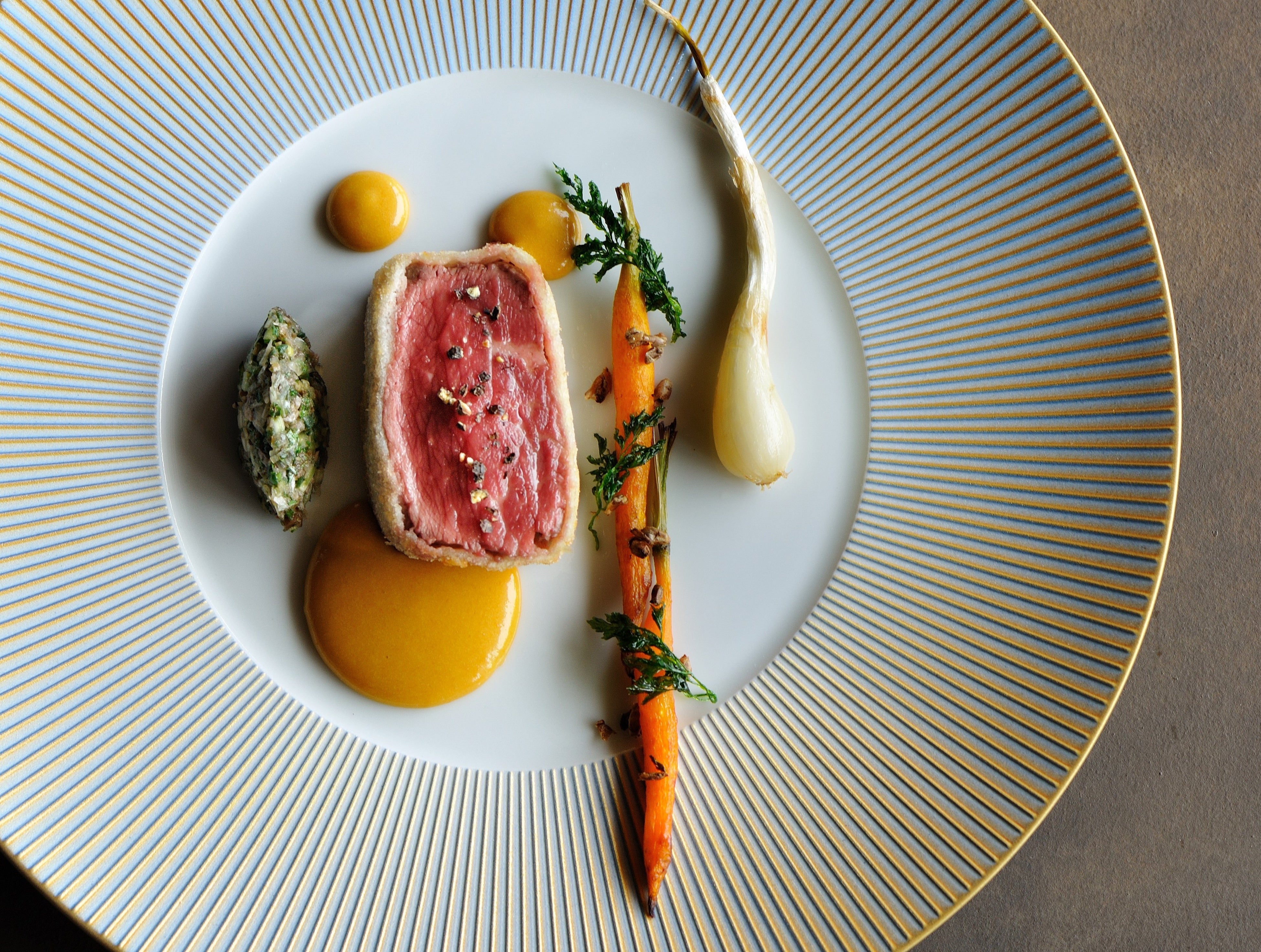 島醤油を作る過程で出るもろみ粕を混ぜた糠床(ぬかどこ)に牛フィレ肉を漬け、深く複雑な発酵香を纏った肉。その独特な香りと肉汁を閉じ込めるため、肉をパン粉で包み、揚げ焼きにしたメインディッシュです。付け合わせの島人参と島らっきょうも糠床に漬け、さらに青パパイヤやゴーヤを使ったコンディメント、焦がしバターのベアルネーズソースには島醤油を加え、一皿のすべてに島醤油のエッセンスを取り入れた料理が完成しました。