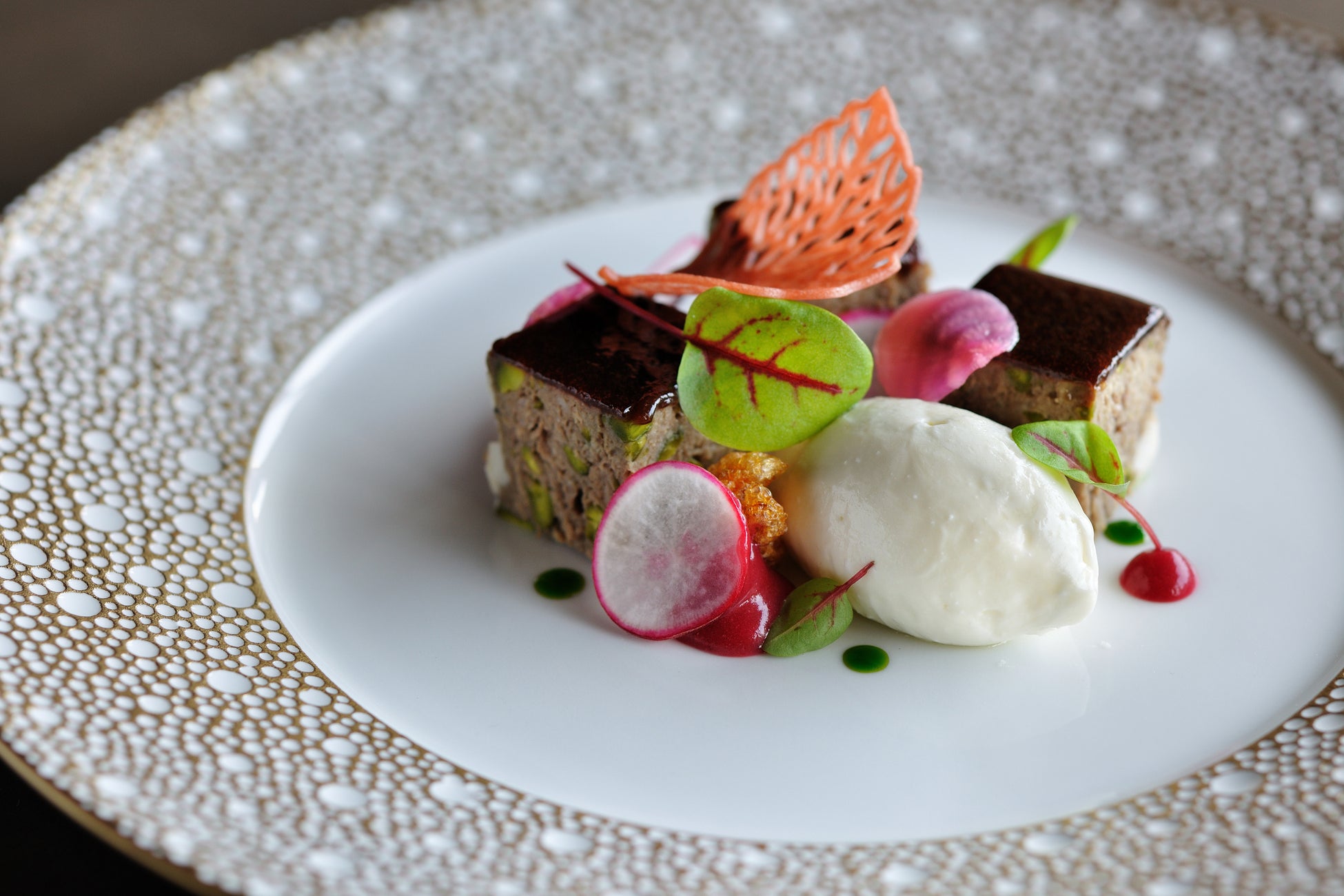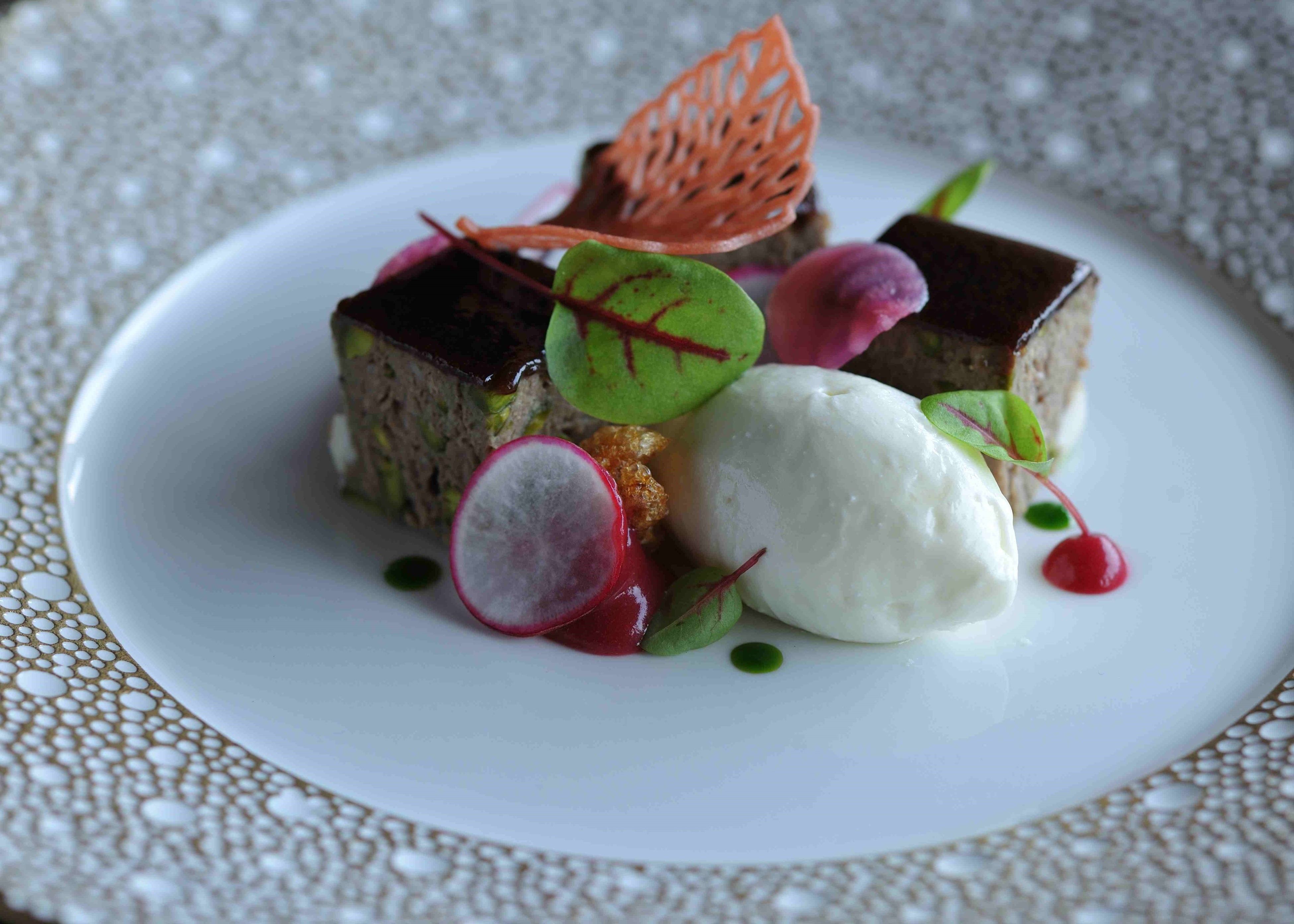 一般的には豚で作るパテ(*2)を、山羊でアレンジした冷前菜。山羊の肉とレバー、さらには血まで活かしており、食材を余すところなく使ったサステナブルな料理です。かつて食糧が少なかった時代、島の方々にとって山羊は大変貴重な栄養源でした。例えば祝い事での振る舞いや、体力回復のための滋養強壮として食され、肉や内臓のすべてを食べていた歴史があります。こうした地域独自の食文化を活かすべく、星のや竹富島では数年前より山羊を用いたフレンチを手掛けています。今回はこれまで以上にさまざまな部位を使用しつつ、島で親しまれているニンニクやフーチバ(ヨモギ)などを組み合わせて、細部まで工夫を凝らしました。シェーブルのクリームも添え、山羊の新たな楽しみ方が詰め込まれた料理を生み出しました。伝統的な山羊食のイメージを覆す一品です。