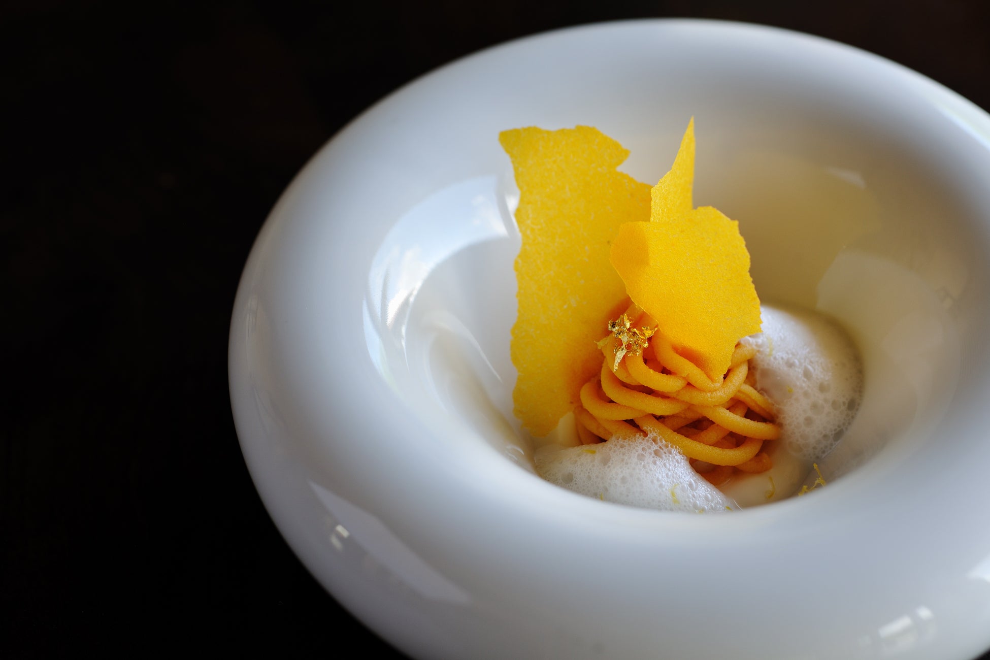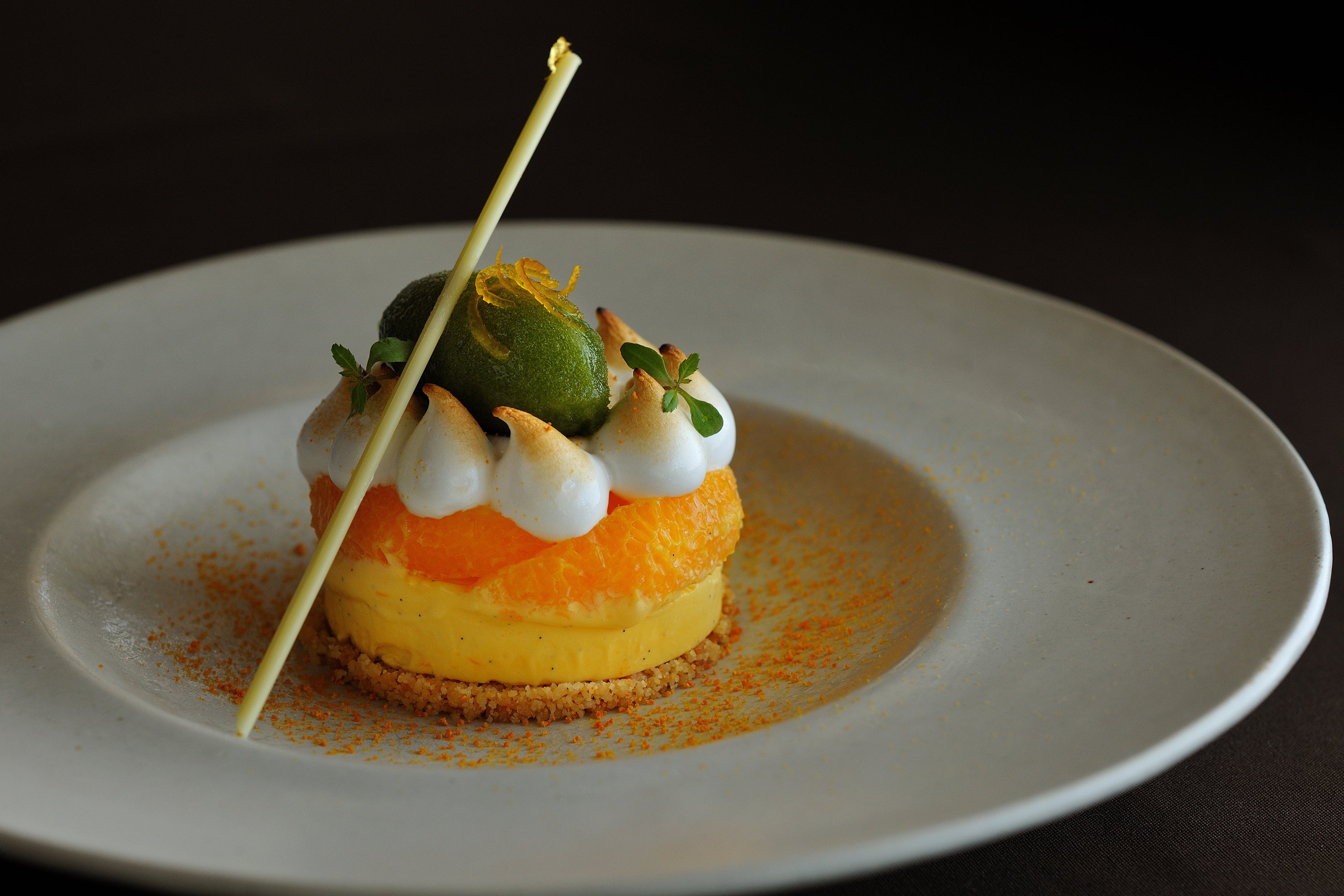 沖縄で冬に旬を迎える柑橘、タンカンをタルトにしました。甘酸っぱい果実の美味しさが口いっぱいに広がります。酸味と甘みのバランスが丁度良いタンカン、軽いくちどけのメレンゲやハーブの爽やかなソルベで構成されたデザートで、それまでの料理の余韻を残しながらディナーを締めくくります。