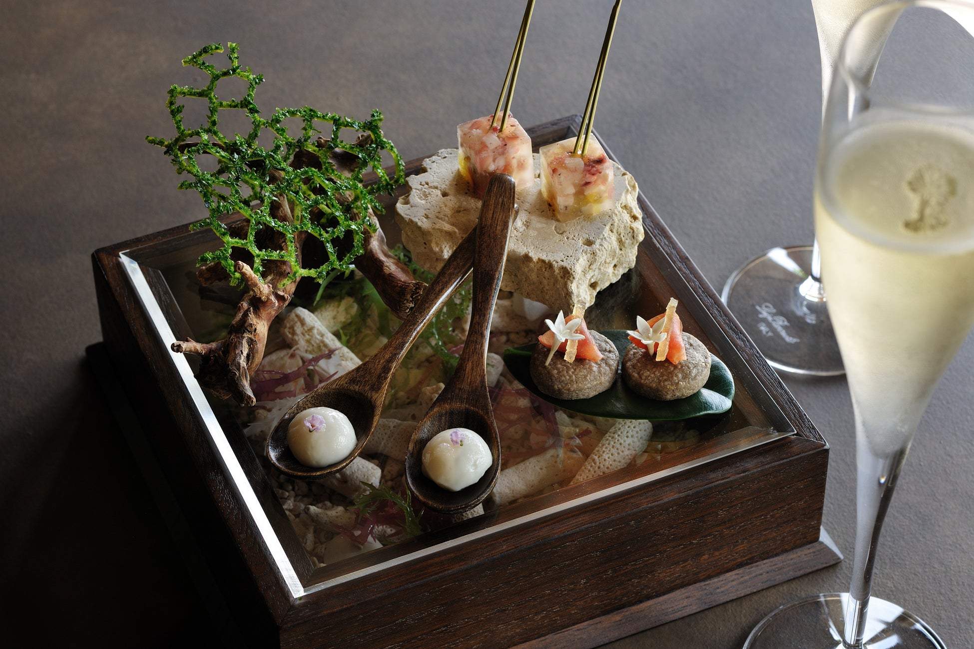 ディナーコースは、島で親しまれる食材や料理のフィンガーフードとアペリティフ(食前酒)からスタートします。ちんすこう、アーサー、ジーマミ豆腐(落花生の豆腐)、ピンタク(島の祭事で振る舞われるニンニクとタコの和え物)など、島ならではの味わいがさまざま楽しめます。