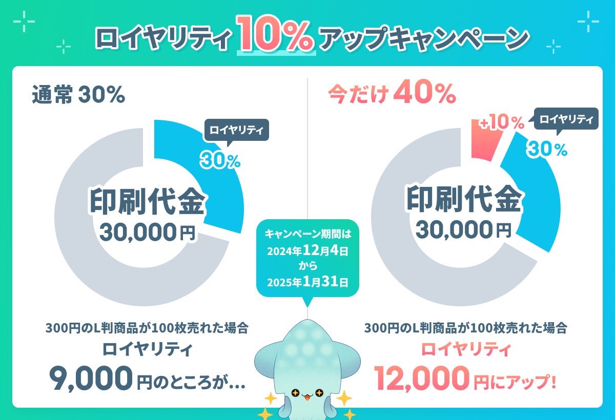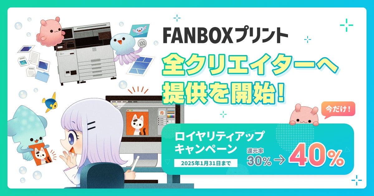 FANBOXプリントの正式リリースを記念して、ロイヤリティ10%アップキャンペーンを開催いたします。通常、FANBOXプリントにおけるクリエイターのロイヤリティ率は30%ですが、キャンペーン期間中の売上については、10%増となる40%をクリエイターに還元いたします。