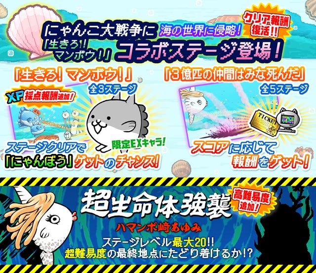 コラボ限定キャラクター「にゃんぼう」が手に入る「生きろ!マンボウ!」、スコアに応じて報酬が手に入る「3億匹の仲間はみな死んだ」、クリアするほど敵が強くなる「ハマンボ崎あゆみ 強襲!」が登場!