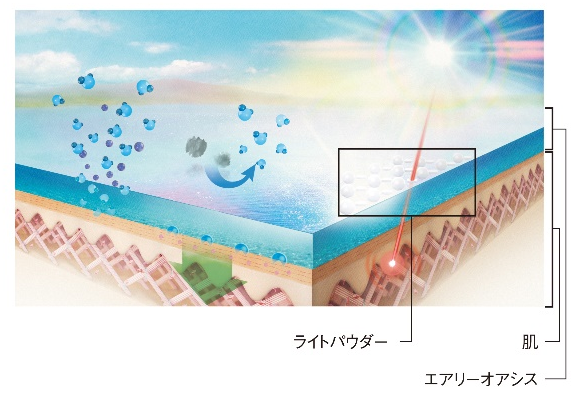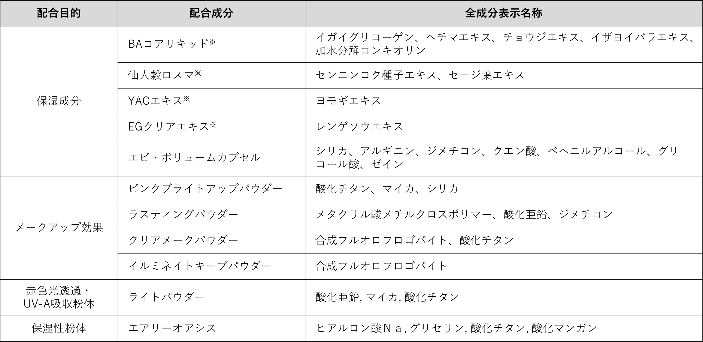 ・自分を取り巻く「空気・光」の環境を活かし、生命感あふれるような水ハリ艶仕上がりを目指す設計「オアシスメーク処方」を採用
