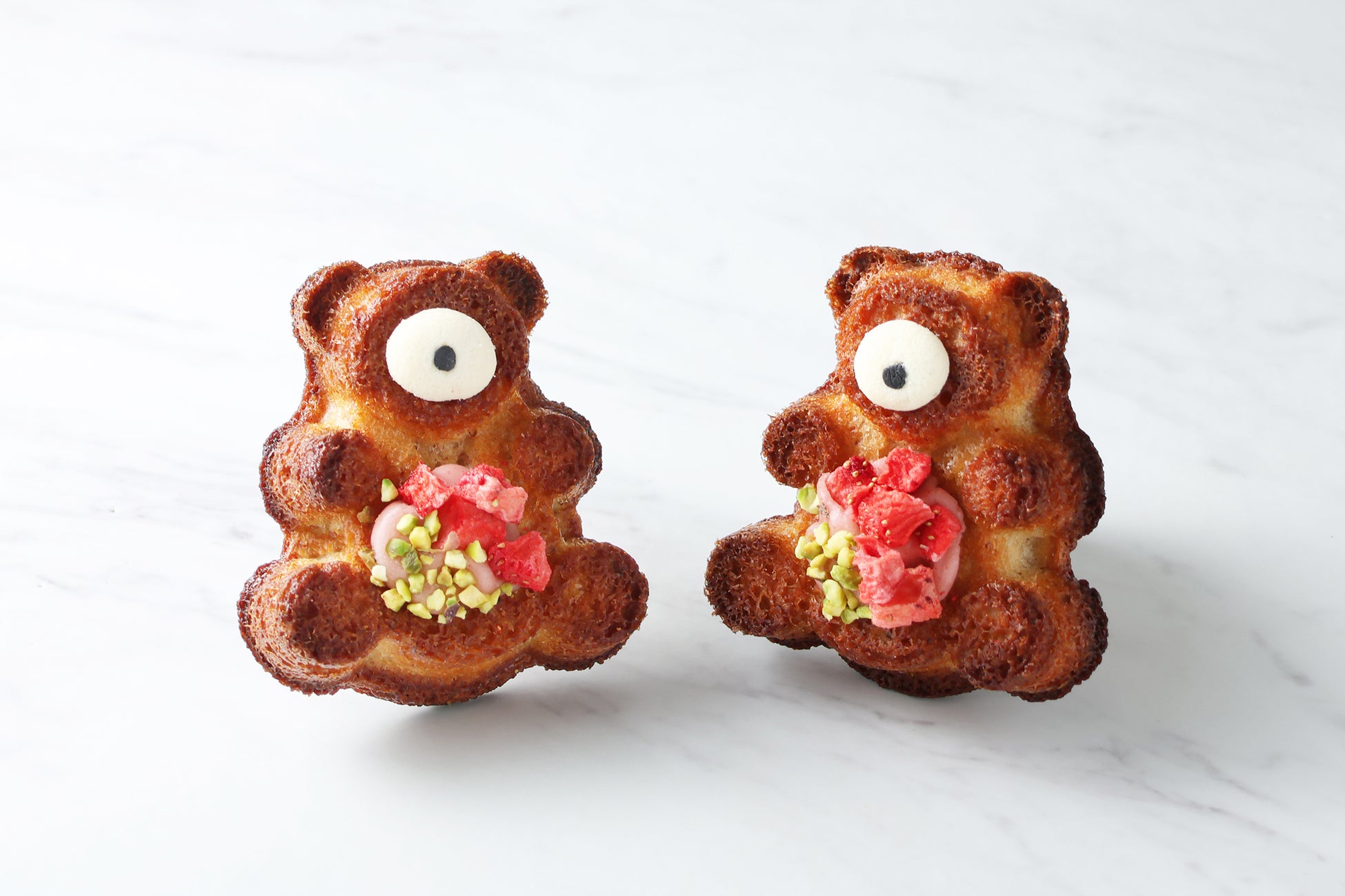 クマ型のフィナンシェ生地に、イチゴのフリーズドライ、ピスタチオをトッピング。