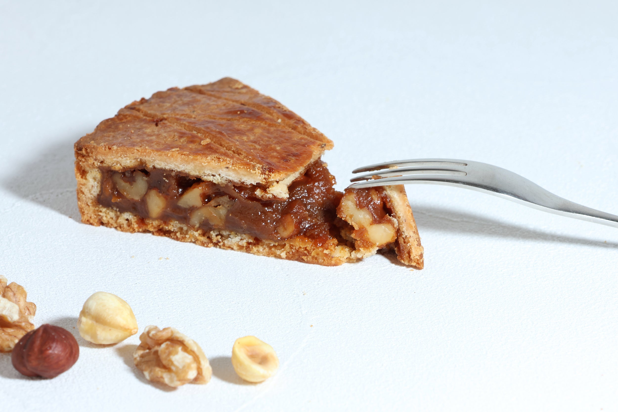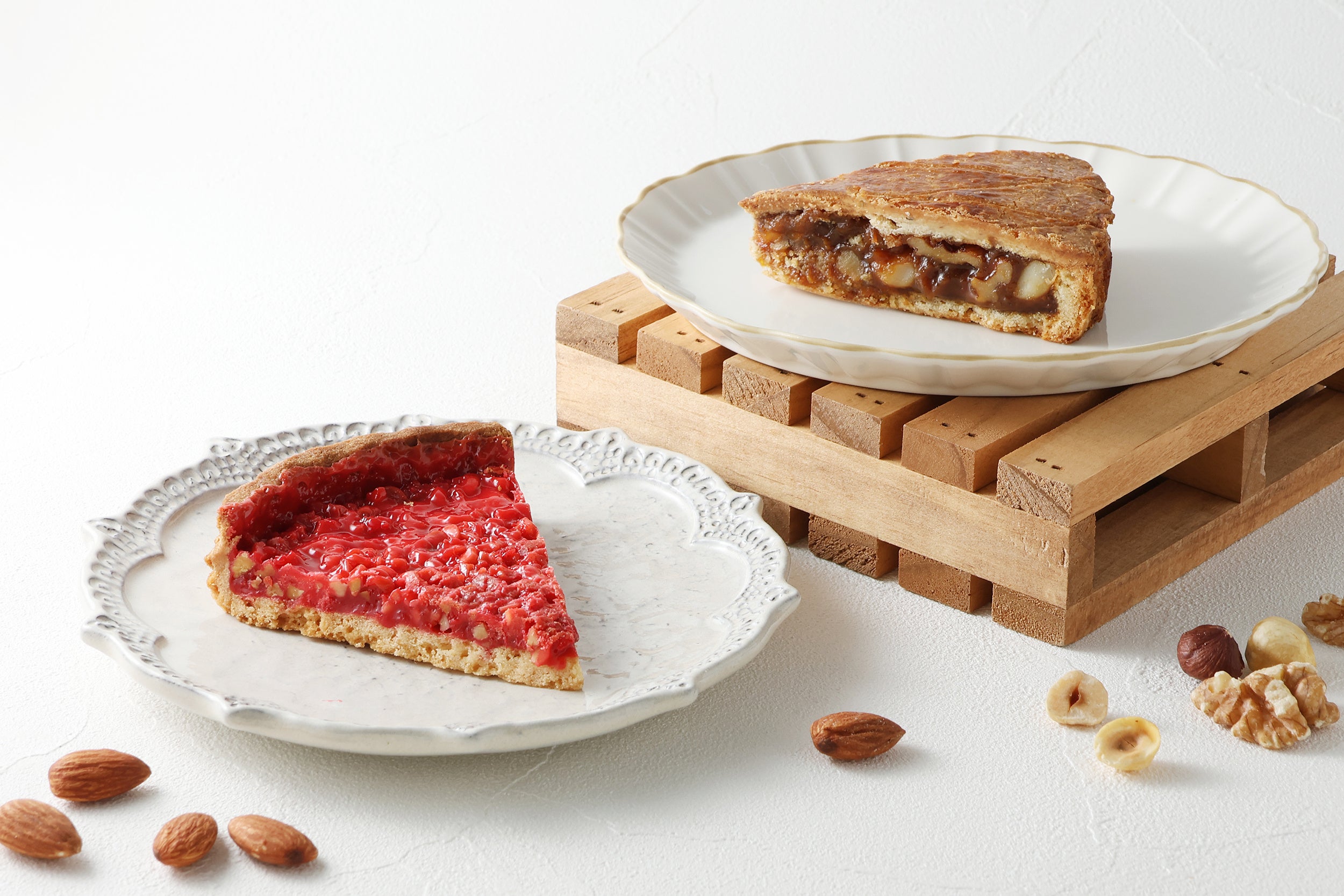 ヘーゼルナッツ香る生地にキャラメルをからめた「ドフィノワ(画像右)」とリヨン銘菓 プラリネルージュを使用した「タルトプラリーヌ(画像左)」をお届けします。