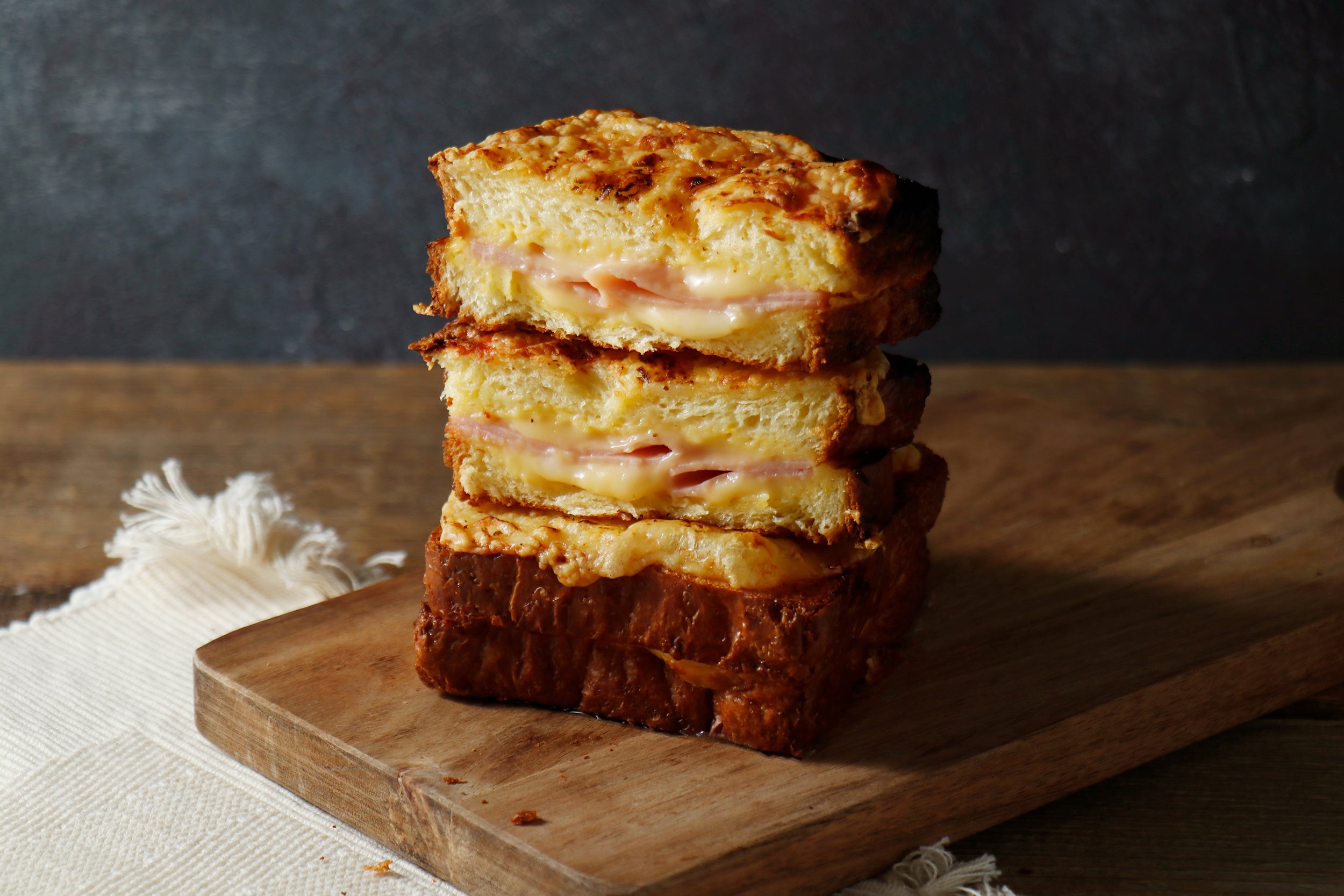 モルネーソースとゴーダチーズ、ハムを挟みこんがりと焼き上げました。