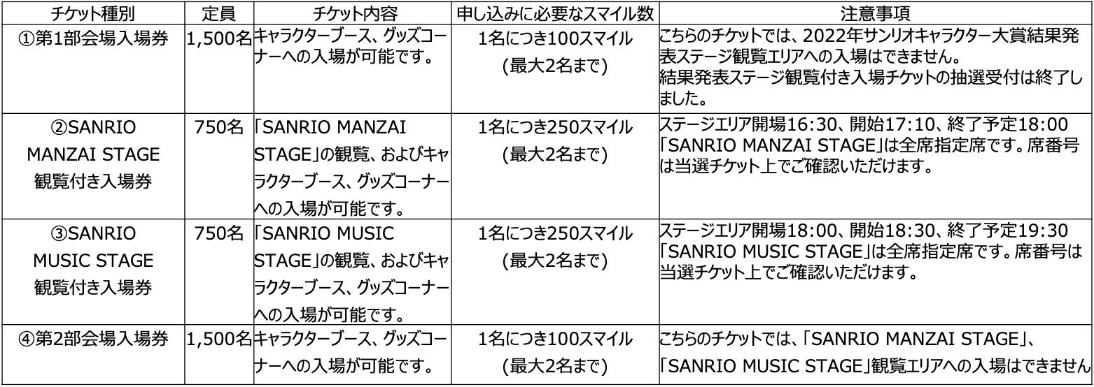 (①第1部会場入場券・④第2部会場入場券のどちらか1回、②SANRIO MANZAI STAGE観覧付き入場券・③SANRIO MUSIC STAGE観覧付き入場券のどちらか1回)