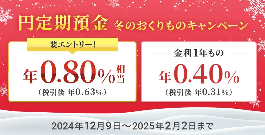 住信SBIネット銀行株式会社(本社:東京都港区、代表取締役社長(CEO):円山 法昭、以下「住信SBIネット銀行」)は、2024年12月9日(月)から2025年2月2日(日)の期間、「円定期預金 冬のおくりものキャンペーン」を実施いたします。