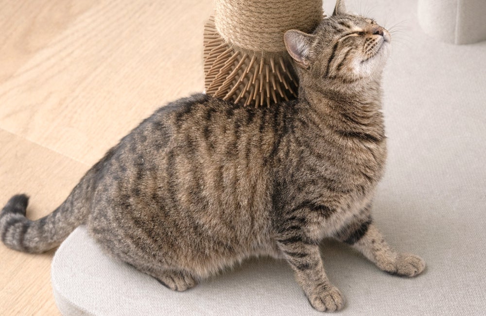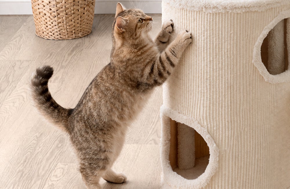 最下段の爪とぎポールには、愛猫が体をこすりつけて毛繕いを行える「すりすりポール」を設け、猫がいつでも心地よく過ごせる工夫を凝らしました。