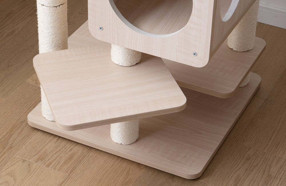 3本設置している爪とぎポールは、長めに設計することにより爪をより研ぎやすい仕様にしています。また爪とぎポールは全面、綿紐仕様にすることで研ぎカスが少なく、お掃除が楽なのはもちろん、よりお部屋に馴染みやすく、麻に比べてにおいが薄い点も魅力です。