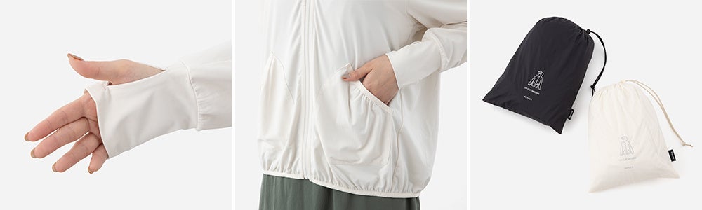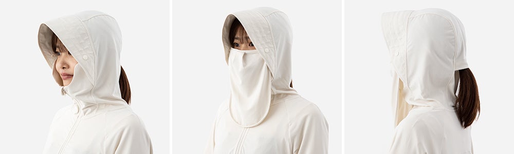 なめらかな生地で、ストレッチ性があり軽量なので、お散歩やランニングにも最適です。仕様もこだわり、紫外線から上半身全体を守るために手の甲まで隠れるホール付き仕様、取り外し可能なフェイスカバーも付いています。さらに、後ろのスリットから髪の毛を出すことができるので、ロングヘアの方も快適で安心して着用できます。