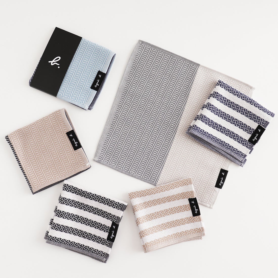 micoとは、3本の糸を撚り合わせた三子糸(みこし)から由来しています。高い吸水性と速乾性が特徴です。バイカラーのデザインを杉綾織と呼ばれるヘリンボーン柄と、定番のボーダーを幾何柄で織り上げた2柄を展開します。シンプルな色柄はユニセックスでもお使いいただけます。