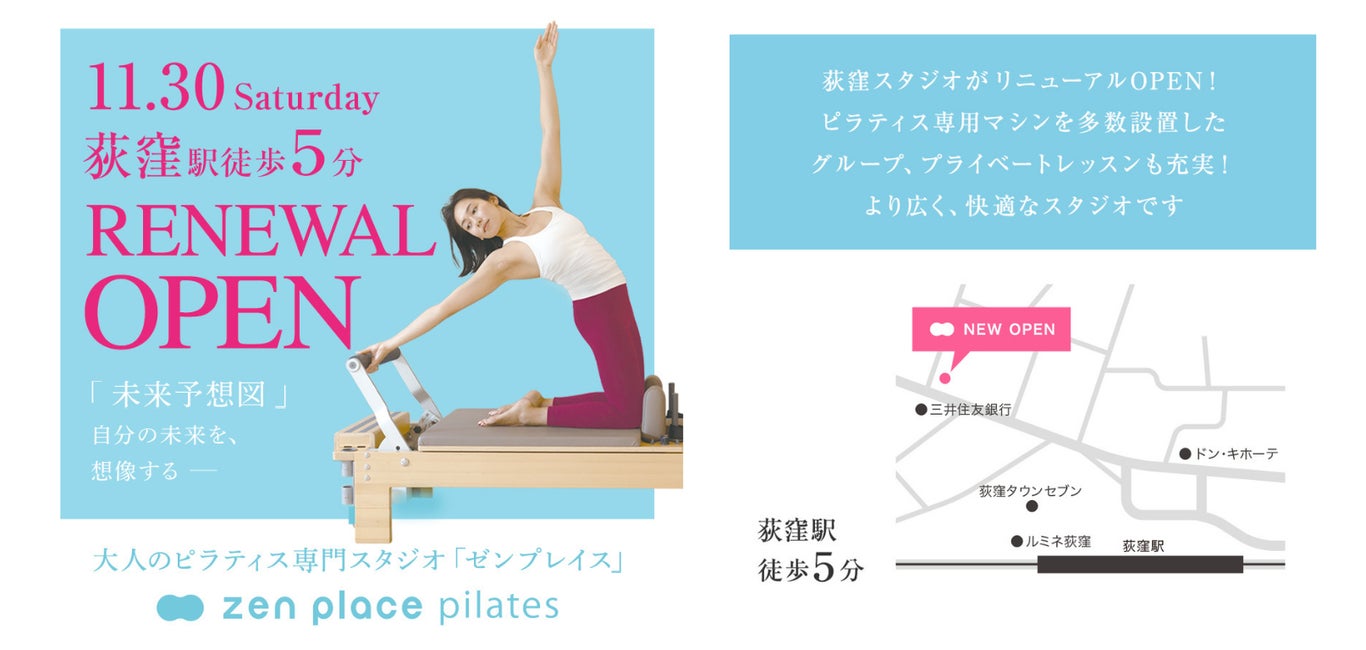 最先端研究結果・科学をもとに、グローバルな環境で最新技術とDXで挑戦を重ね、サービス業界にイノベーションを起こしている最先端のWeb3.0 DX企業であり、ウェルビーイング創造のリーディングカンパニーである株式会社ZEN PLACE(本社:東京都渋谷区 代表取締役:尾崎成彦)は、荻窪駅から徒歩5分の好アクセス・好立地に各種マシンを完備した最新ピラティス専門スタジオ「zen place pilates荻窪スタジオ」を2024年11月30日(土)に拡張・移転オープンします。