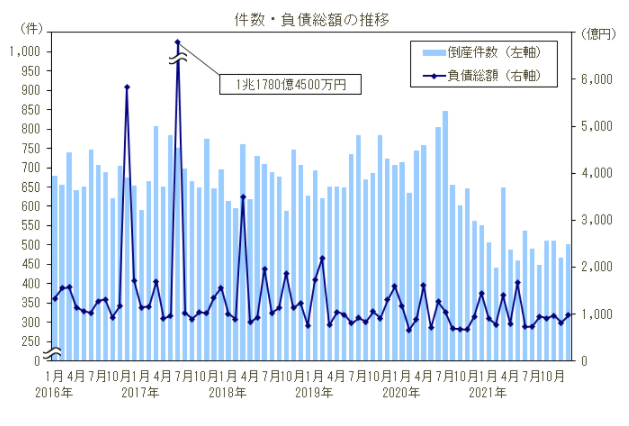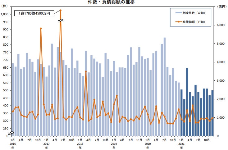 倒産件数は501件、12月として平成元年以来32年ぶりの低水準 ― 全国企業倒産集計・2021年12月報