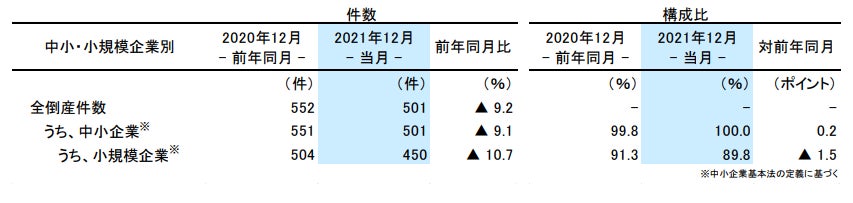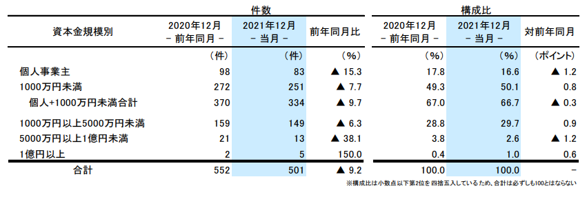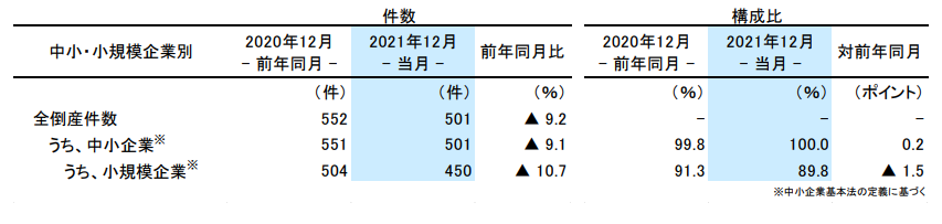 - 倒産件数は501件、12月としては2000年以降最少、1999年以前と比較しても1989年(平成元年)以来32年ぶりの低水準