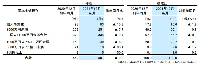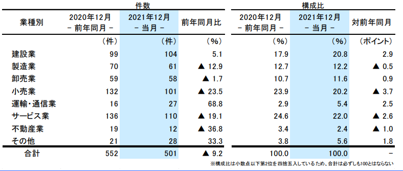 倒産件数は501件(前年同月552件、前年同月比51件・9.2%減)と、12月としては2000年以降最少、1999年以前と比較しても1989年(平成元年)以来32年ぶりの低水準で推移した。引き続き倒産が抑制された状況が続き、7カ月連続の前年同月比減。