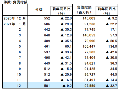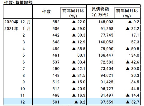 ■件数・負債総額:倒産件数は501件、12月としては平成元年以来32年ぶりの低水準