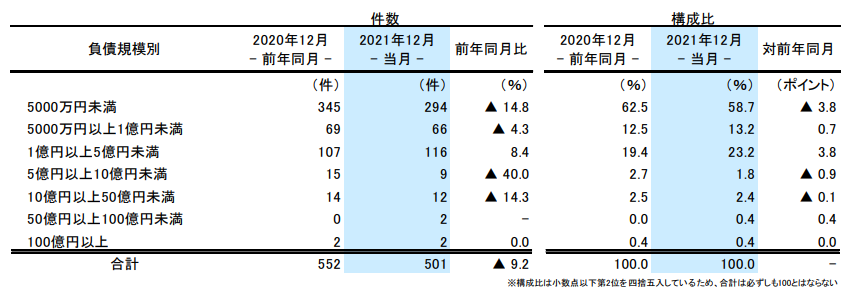 - 負債規模別にみると、負債5000万円未満の倒産は294件(前年同月345件、14.8%減)、構成比は58.7%を占める