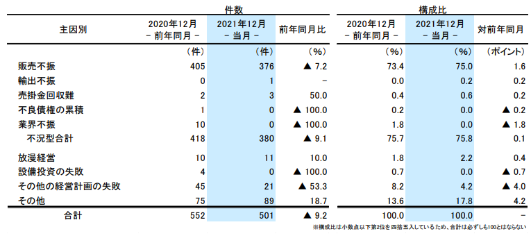 - 主因別にみると、「不況型倒産」の合計は380件(前年同月418件、9.1%減)と、7カ月連続で前年同月を下回った。構成比は75.8%(対前年同月0.1ポイント増)を占める