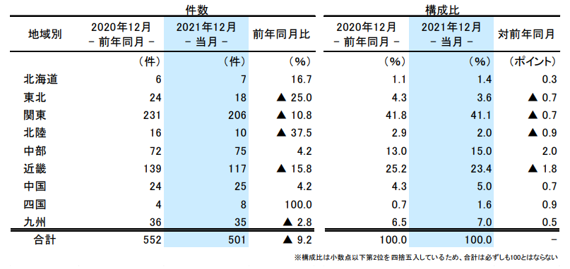- 地域別にみると、9地域中5地域で前年同月を下回った。なかでも関東(前年同月231件→206件、10.8%減)は、東京都(同120件→105件)などの減少で前年同月比2ケタ減。近畿(同139件→117件、15.8%減)も同様に7カ月連続の2ケタでの大幅減となった