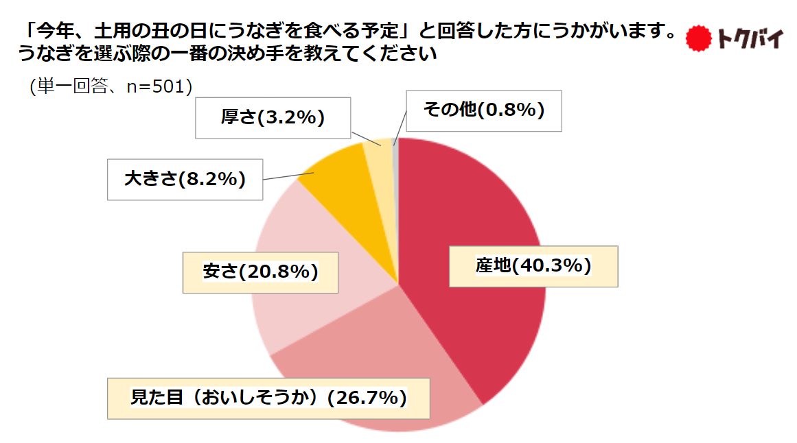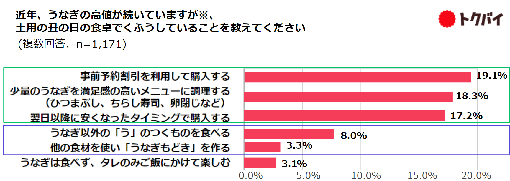 また、「うなぎ以外の『う』のつくものを食べる」8.0%、「他の食材を使い『うなぎもどき』を作る」3.3%など、「うなぎ以外」のものを取り入れて土用の丑の日の食事を楽しむ人も一定数いることがわかりました。