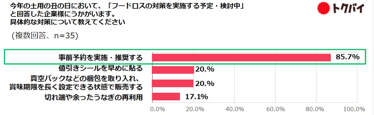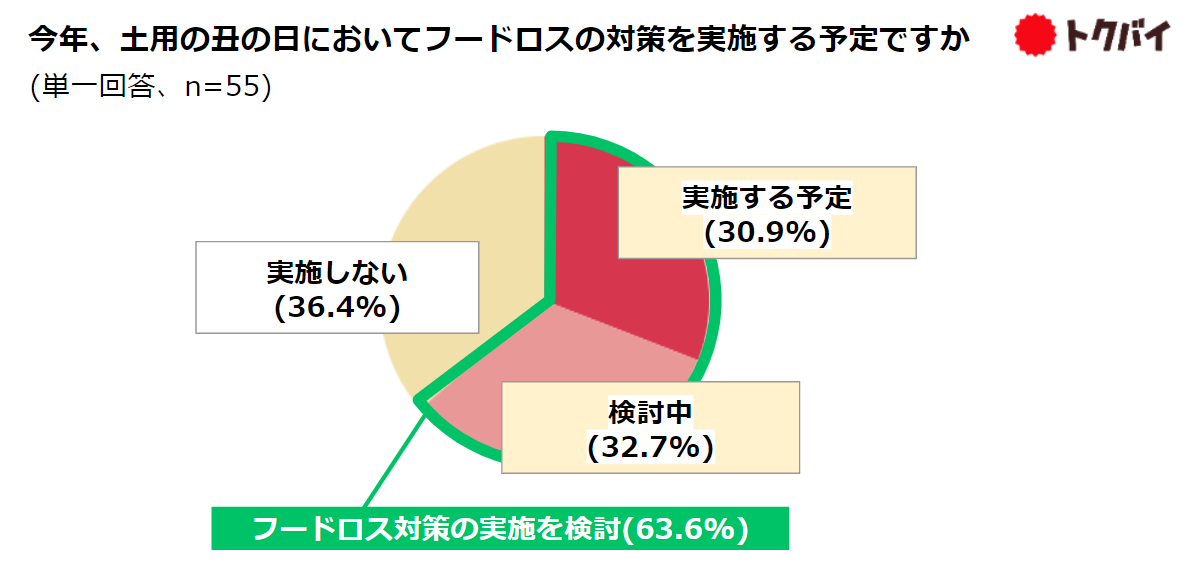 また、スーパーマーケットをはじめとする6割以上の企業が、土用の丑の日においてフードロス対策の実施を検討しており、そのうち8割以上の企業が「事前予約の実施・推奨」を検討していることがわかりました。