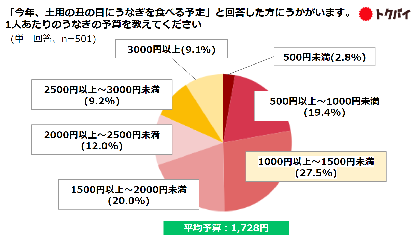 続いて、土用の丑の日にうなぎを食べる予定の方に、うなぎを選ぶ際の一番の決め手をたずねたところ、「産地」40.3%が最多、次いで「見た目(おいしそうか)」26.7%、「安さ」20.8%となりました。うなぎにかける1人あたりの予算についてたずねたところ、「1,000円以上~1,500円未満」の価格帯が27.5%で最多、平均予算は1,728円となりました。