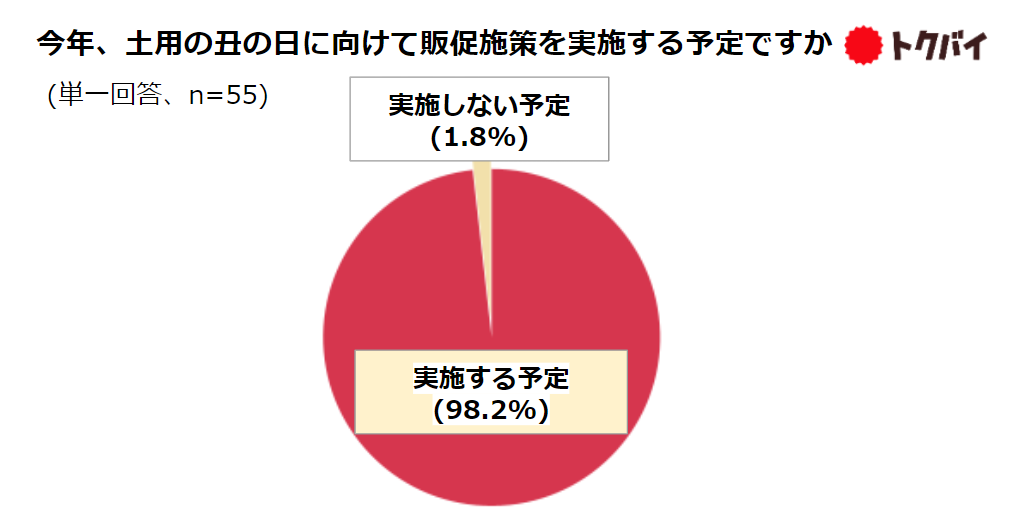 スーパーマーケットをはじめとした食料品を扱う「トクバイ」の導入企業に土用の丑の日に向けて販促施策を実施する予定があるかたずねたところ、98.2%が「実施する予定」と回答しました。