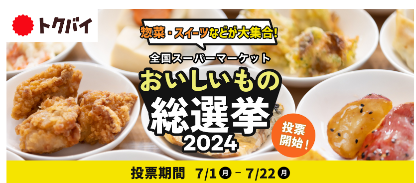 2024年7月1日(月)〜7日22日(月)の期間で、「トクバイ」ユーザーをはじめとする一般生活者の方々からの投票を実施しています。味、見た目、コストパフォーマンス、その他様々な理由を元に投票できるため、店舗の規模や知名度、商圏に関係なく、「食べたことがあり、ぜひおすすめしたい!」という商品はもちろんのこと「これは食べてみたい!」と思う商品なども選ばれます。