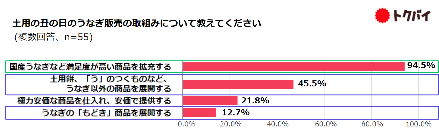 続いて、土用の丑の日のうなぎの販売の取り組みについてたずねたところ、9割以上が「国産うなぎなど満足度が高い商品を拡充する」と回答しました。また、「土用餅、『う』のつくものなど、うなぎ以外の商品を展開する」45.5%、「うなぎの『もどき』商品を展開する」12.7%と、「うなぎ以外」の商品で土用の丑の日を楽しめる施策を展開する企業も多いことがわかりました。