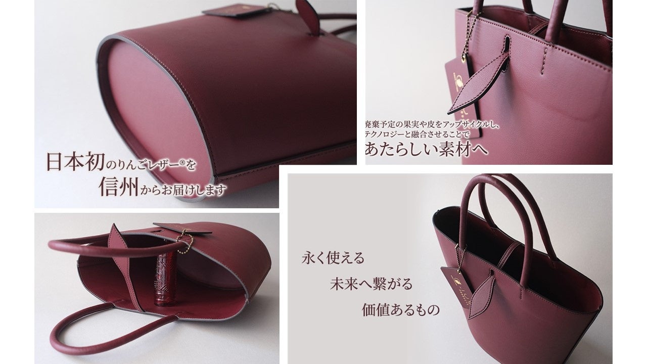 今回はそのサポートの1つとして長野市が掲げる『環境共生都市「ながの」』の実現に向けての取組の一環として廃棄予定の果実や皮をアップサイクルし、テクノロジーと融合させることであたらしい素材に生まれ変わらせた「りんごレザー®」を使ったトートバッグです。