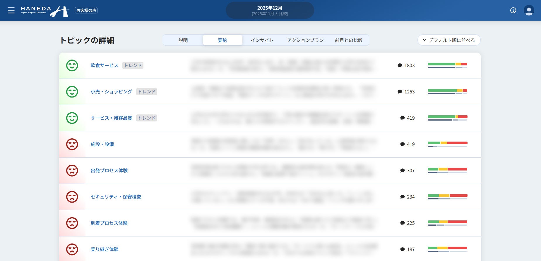 単語単位の分析にとどまる従来のテキストマイニングとは異なり、お客様の声を文脈で理解することで、完全にカスタマイズしたカテゴリに高精度に分類できます。SNS・アンケートなどから寄せられる空港利用者の声を構造的に整理し、今後の活用を見据えた分析が可能となる点が評価されました。