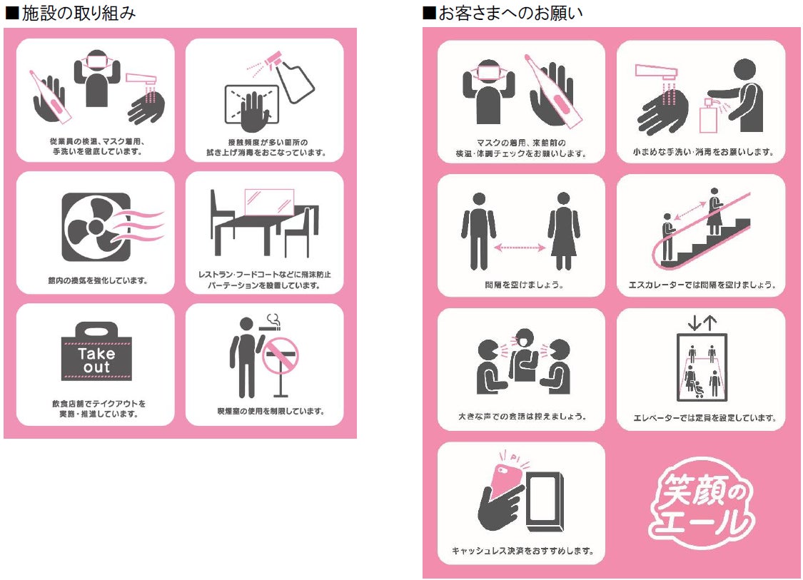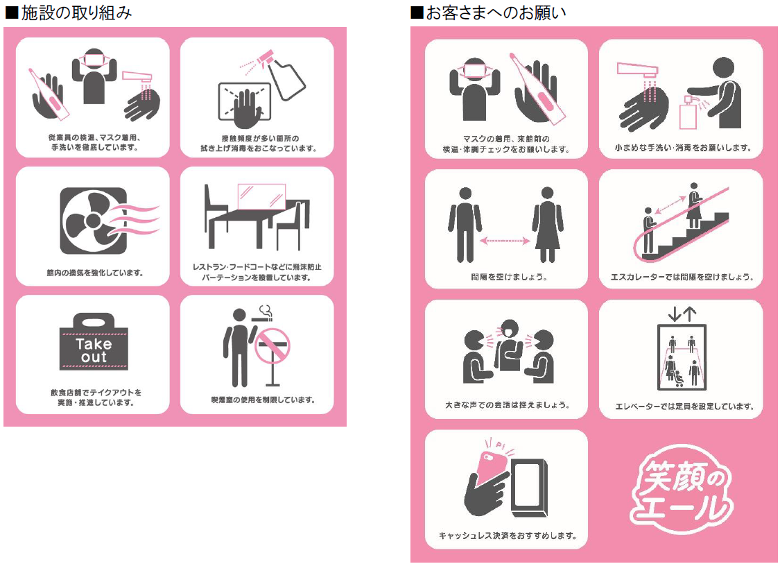 三井不動産グループが運営する商業施設では、新型コロナウイルス感染拡大防止のため、下記をはじめとしたさまざまな取り組みを実施しております。