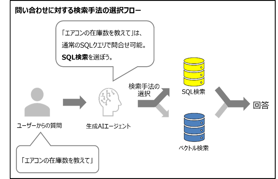 商用のOracle Database 23aiに新たに生成AI用のベクトル検索機能が追加されたことを受け、基幹システムでの採用が多いOracle Databaseの導入を検討するため、プロジェクトを開始しました。本プロジェクトでは、従来のベクトル検索のみのRAGアーキテクチャに加え、ユーザーの質問から自動的にSQL文を生成し、リレーショナルデータベース*4から情報をSQL検索できる機能を実装しました。これにより、ユーザーからの質問に対してエージェントAIが最適な検索方法を選択するため、ユーザーは意識することなく簡単に情報を入手することができます。