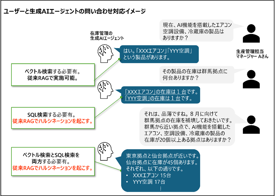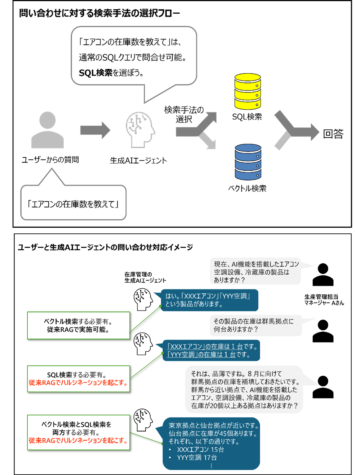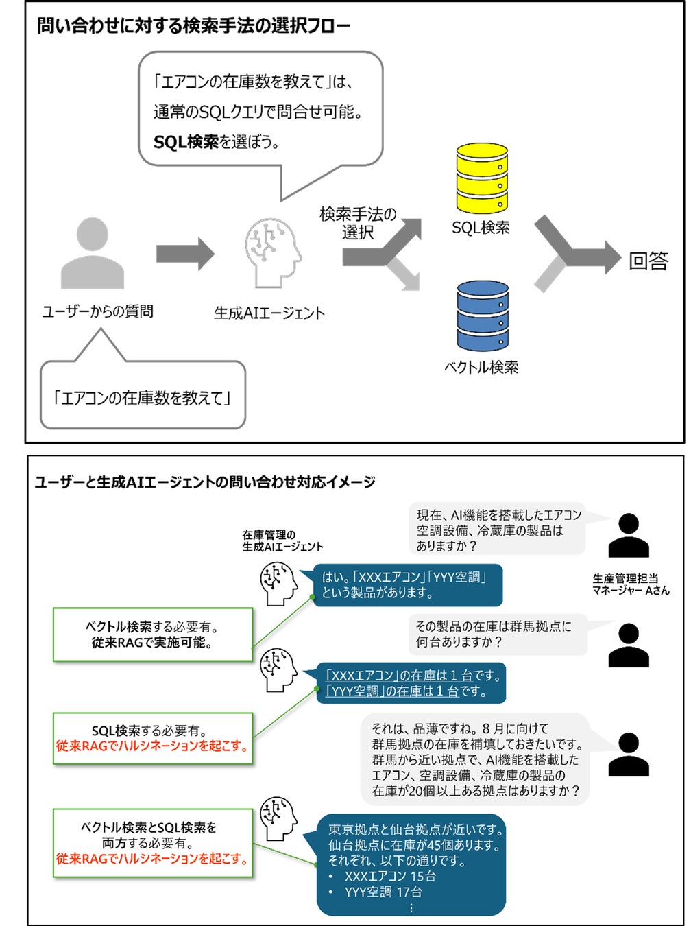 上:問い合わせに対する検索手法の選択フロー 下:ユーザーと生成AIエージェントの問い合わせ対応イメージ