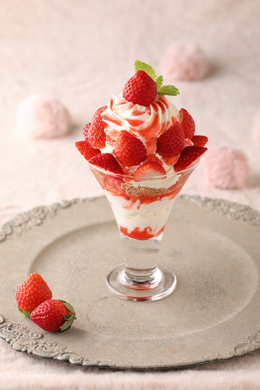 甘みと酸味のバランスが良くコクのある「紅ほっぺ」の果実を約9粒使用し、自家製の紅ほっぺソースを合わせた、いちごをたっぷり味わえる冬限定のパフェです。トッピングにはいちごと相性の良いバニラアイス・サワーグルトアイス・ホイップクリーム・サクサク食感のフィアンティーヌを使い、いちごの甘みと程良い酸味をお楽しみいただけます。