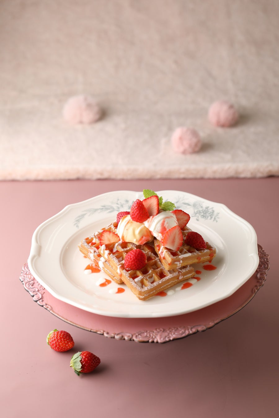 毎日お店で生地から作り上げる焼きたてサクサクのワッフルに、香り豊かな紅ほっぺの果実を合わせ、バニラアイスとホイップクリーム、自家製の紅ほっぺソースと爽やかなヨーグルトソースをトッピングしました。素材のおいしさを引き出す組み合わせで、風味豊かないちごのおいしさを存分に味わえます。紅茶との相性も楽しんでいただきたい冬のワッフルです。