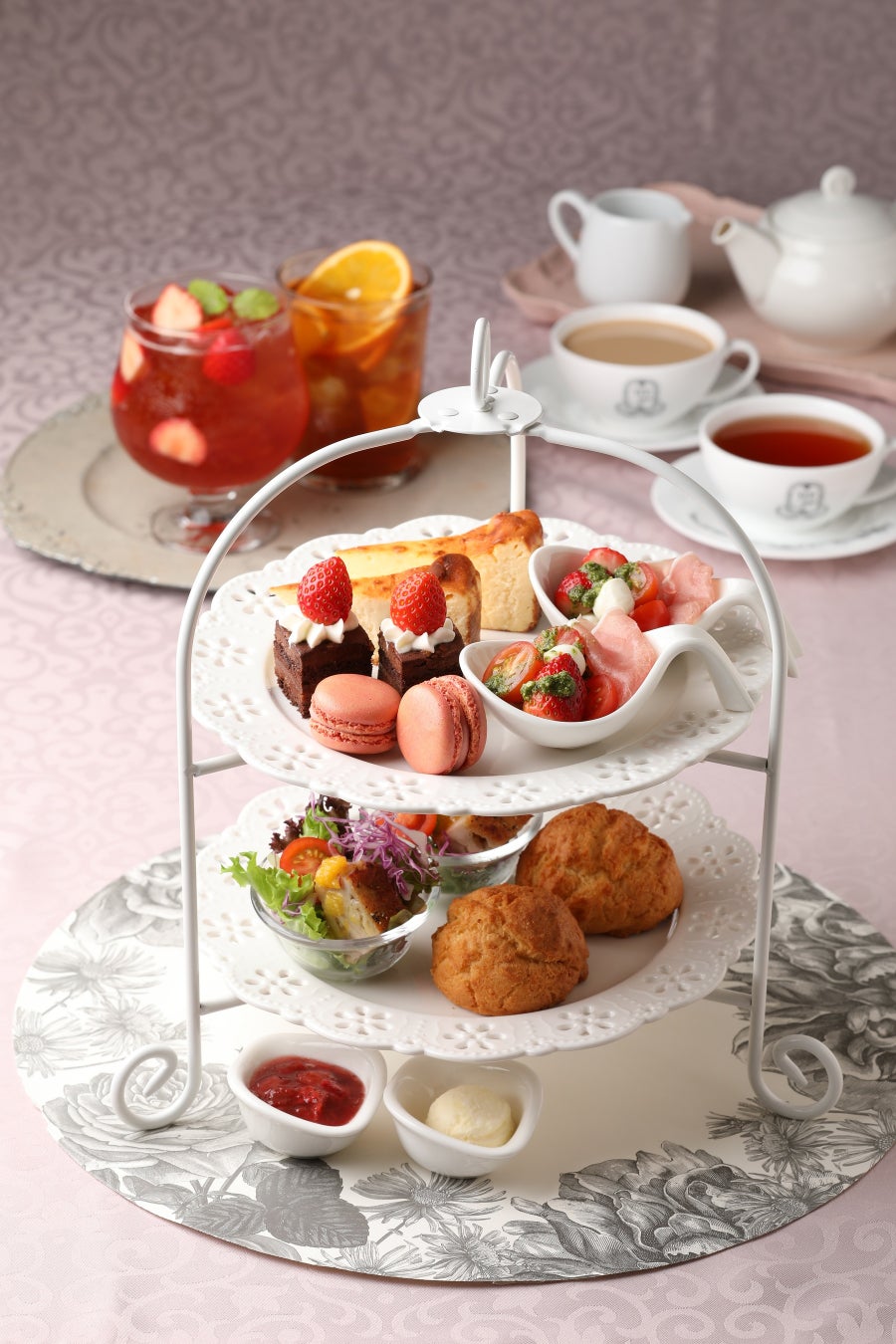 季節のケーキやオリジナルスコーンを紅茶で味わう贅沢な「アフタヌーンティーセット」がさらにおいしくリニューアルしました。上段には2種類のケーキに加え、いちごのマカロンといちごのカ プレーゼが並び、下段はスコーンとセイボリーサラダが並びます。お店で焼き上げたオリジナルス コーンは、お好みでクロテッドクリームやいちごジャムをつけてお召し上がりください。スイーツと相性の良いイングリッシュミルクティーに加えて、お好きなドリンクメニューをもう1種類お選びいただけます。