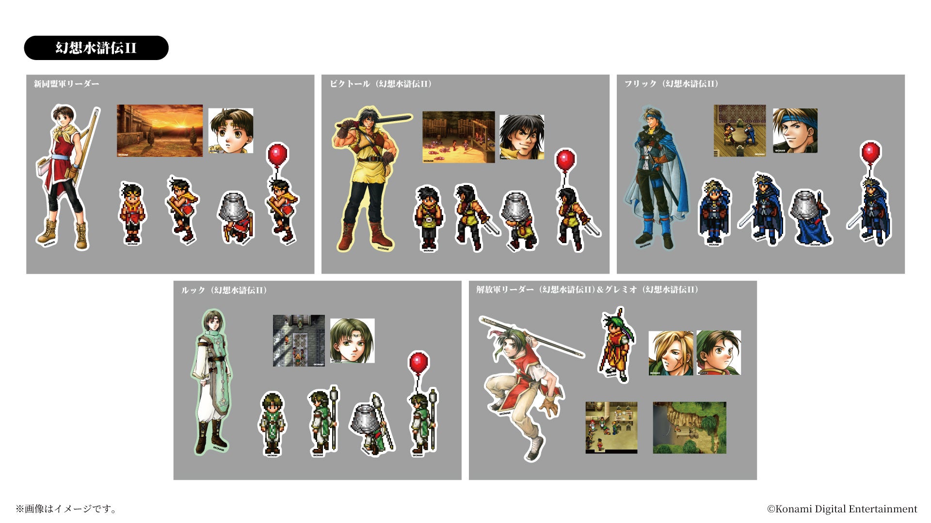 このたび、「幻想水滸伝」シリーズ30周年を記念し、ゲストアーティストとして漫画家の高屋奈月先生と横槍メンゴ先生による描き下ろしお祝いイラストとメッセージを公開します。これらのイラストは、会場内で展示するほか、後期からイラストを使用したクリアファイルの販売も予定しています。また、『幻想水滸伝I』、『幻想水滸伝II』に登場するキャラクターの、全30種類のアクリルスタンドや、全83種類にも及ぶドット絵ステッカーなど、「幻想水滸伝」の魅力が詰まった追加グッズの販売も決定しましたので、ぜひご期待ください。