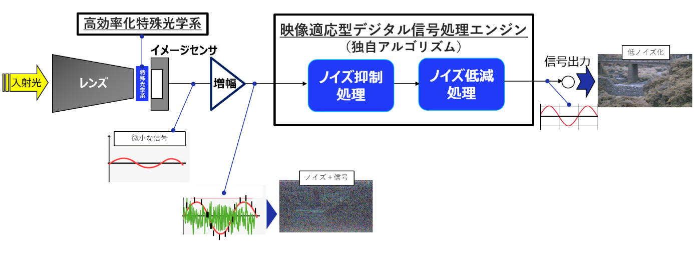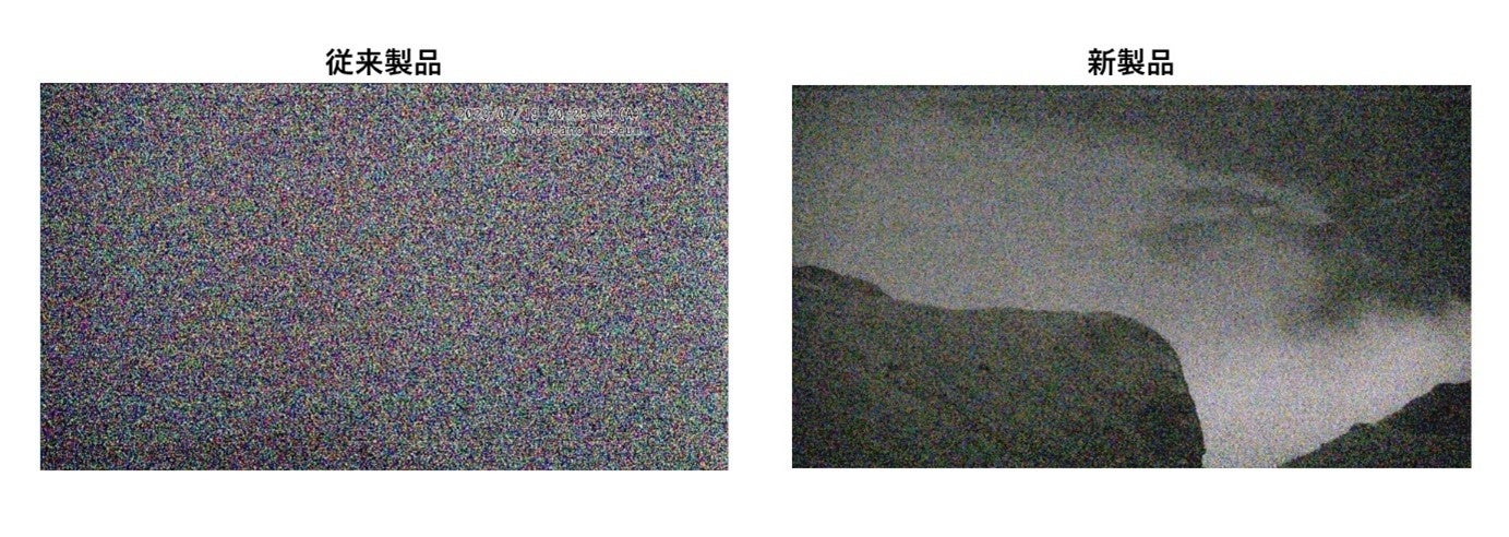 新製品は、長年培ってきた高感度撮影のノウハウをもとに当社独自で新たに開発した微弱な光の信号を検出できる特殊光学技術を用いた「高効率化特殊光学系」と、検出した光の信号をノイズ抑制・低減させるという2段階処理を独自アルゴリズムで行う「映像適応型デジタル信号処理エンジン」を搭載しています。これらの機能を組み合わせることにより、超高感度撮影時におけるノイズを従来製品に比べ約75%低減し、これまでノイズに埋もれて視認できなかった星明り程度の暗がりでもデジタル映像化することが可能になりました。